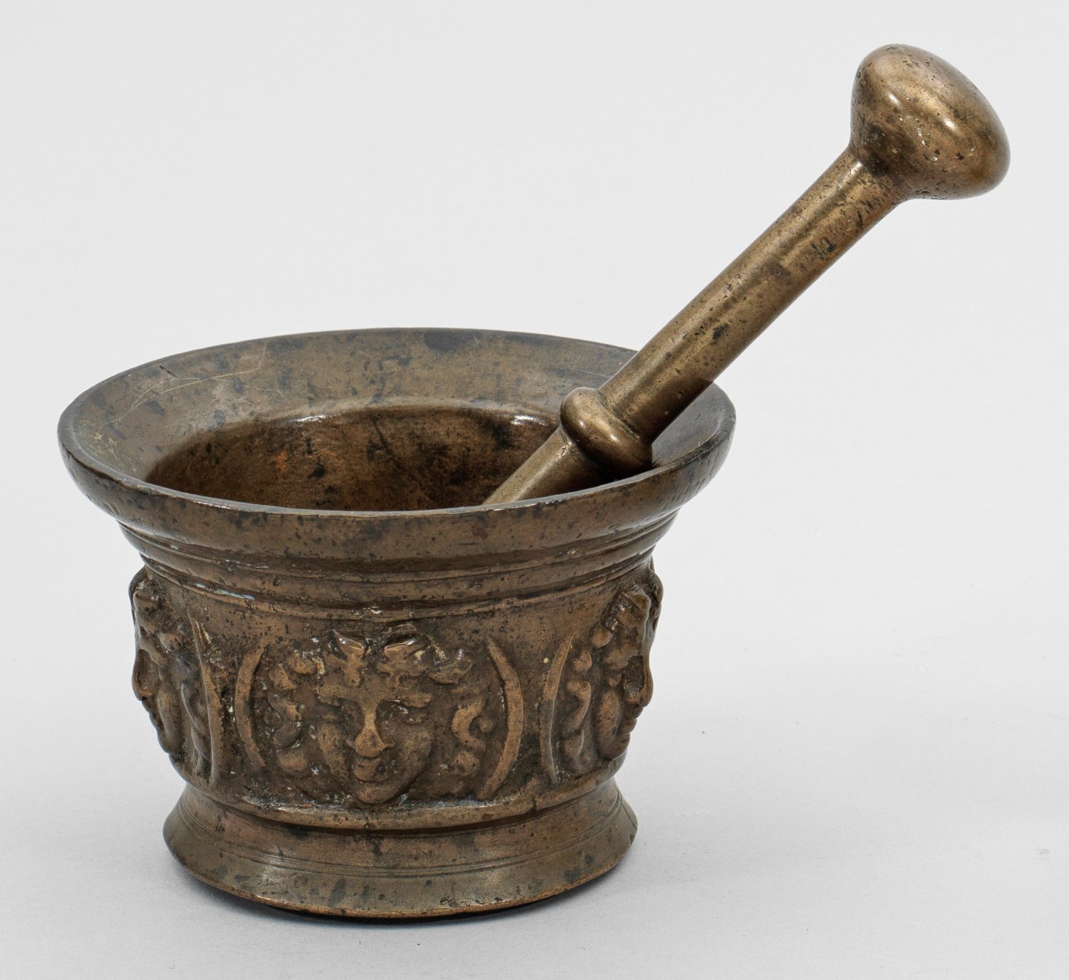 Bronze, goldbraun patiniert. Über gering ausgestelltem Stand konischer, niedriger Korpus mit weit ausschwingendem Rand. Wandung umlaufend verziert mit reliefplastischen Maskarons, gerahmt von sichelförmigen, kurzen Rippen. H. 9 cm. D. 13 cm. Pistill-L. 19 cm.