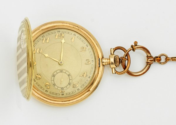 Schweiz. Um 1930. Gelbgold, gest. 14 k sowie mit Signet der "Chambre suisse d'Horlogerie". Savonettegehäuse mit gestreiftem Dekor und Gravur. Goldcuvette. Matt-goldenes Zifferblatt mit arabischen Indexen, kleiner Sekunde und Scoties-Zeigern. Vergoldetes Brückenwerk mit Kompensationsunruh, Ankerhemmung und Kronenaufzug. Gehäusenr. 13129. Vergoldete Uhrenkette. Gew. 97,2 g. D. 5,6 cm.