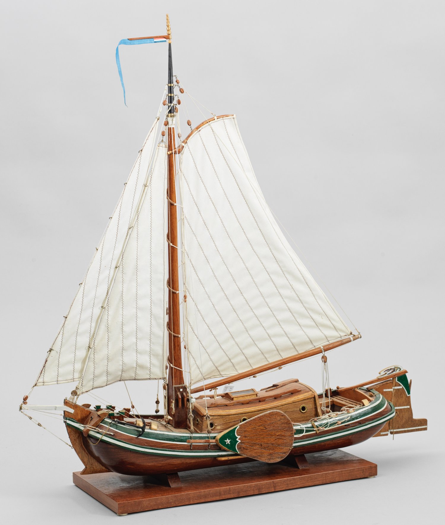 Lackiertes Holz mit Leinenstoff und Metallmontierung. Auf Holzpodest Modellschiff "Jachtschiff Boeier" nach dem Originalboot, entworfen in der Werft "Gebr. De Boer", Ende 19. Jh.; Detaillierte Miniaturversion mit Groß- und Kleinsegel, Ruderblatt mit -pinne und umfangreicher Takelage. Maßstab 1:87. 81 x 78 cm.