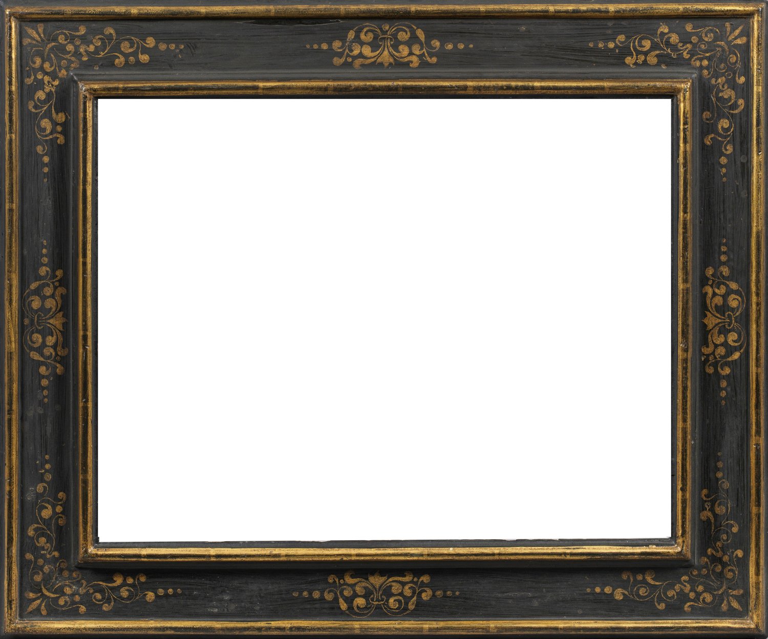 Holz, schwarz gefasst und teilw. vergoldet. Rechteckige, breit profilierte Rahmung mit Dekorationen aus Volutenmotiven. 82 cm x 67 cm. Falzmaß: 64 cm x 48 cm.