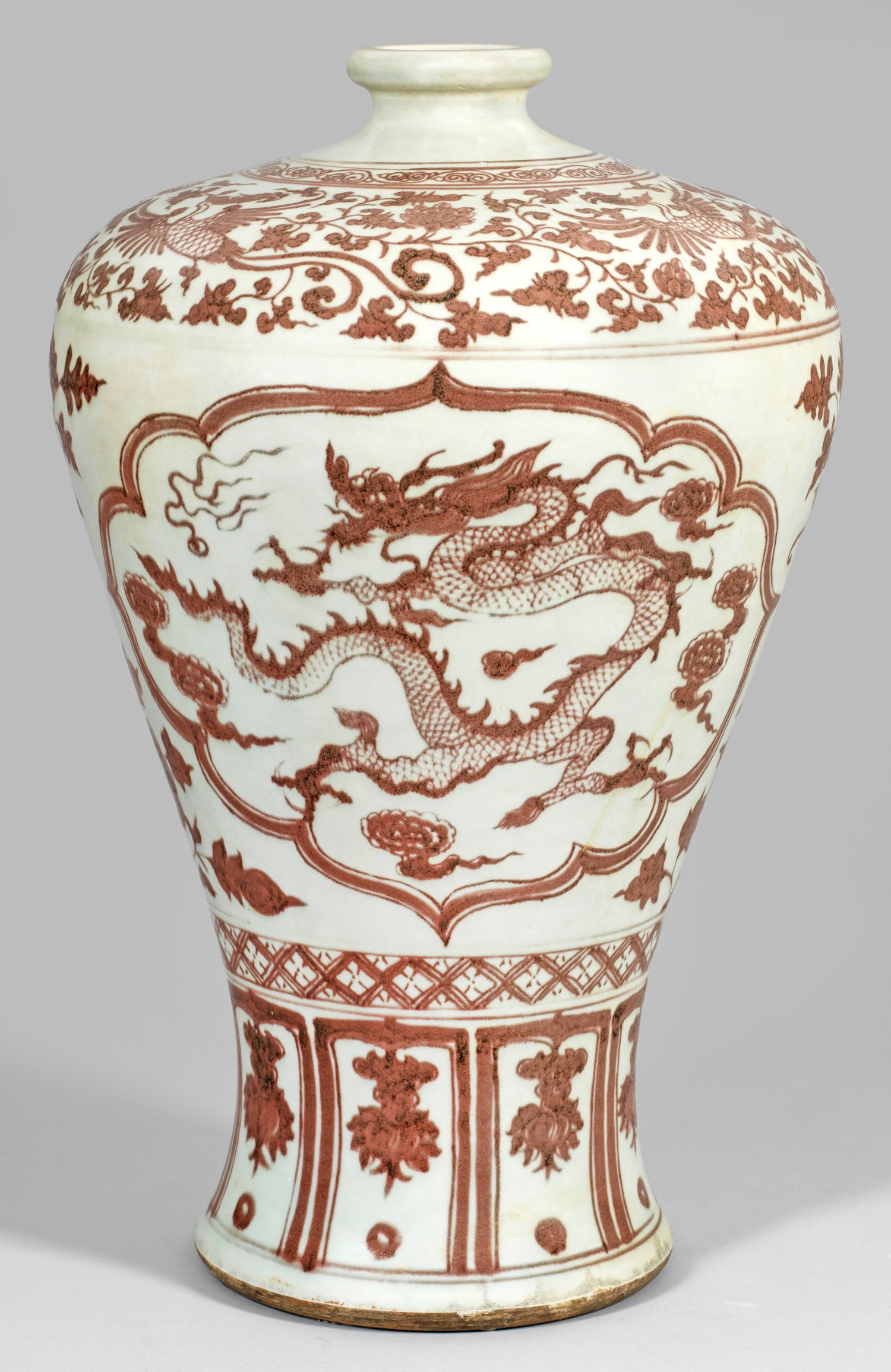 Porzellan. Auf der Wandung unterglasurroter Dekor aus passig geschweiften Reserven mit dreiklauigem Drachen, flankiert von Chrysanthemenzweigen, Fenghuang-Vögeln zwischen Rankenwerk sowie umlaufenden Bordüren aus Blatt-, Brokat- und Wolkenmotiven. H. 58 cm.