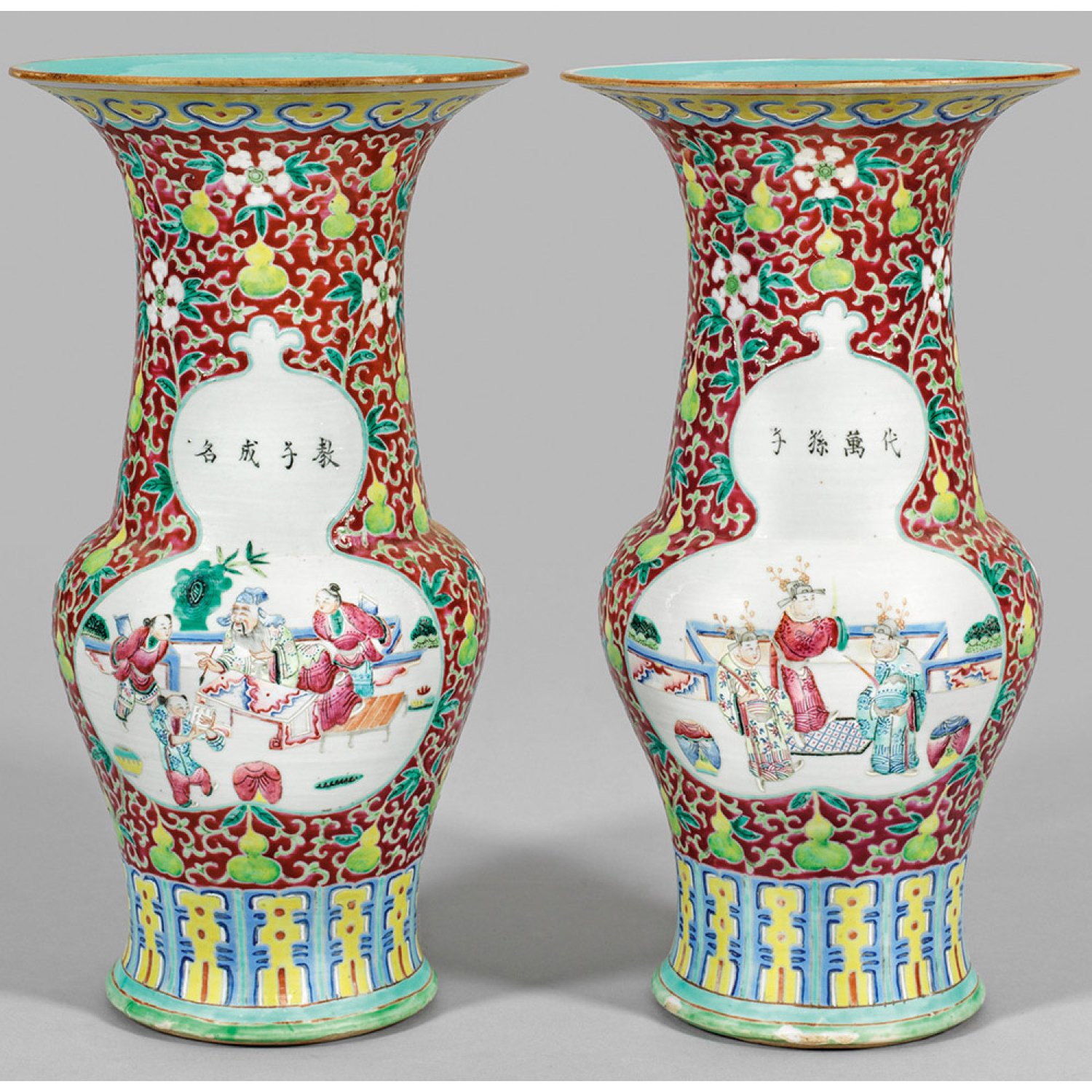 Porzellan. Beidseitig der Wandung, in flächendeckendem, framboisefarbenem Fond aus Rankenwerk, Flaschenkürbissen und Blüten, ausgesparte Reserven. Darin höfische, szenische Darstellungen, u. a. mit Gelehrten und Schülern in polychromer Emailmalerei. Umlaufende Bordüren aus stilisierten Ruyiköpfen und Blattmotiven. Schwarze Kalligraphie. Türkisfarbene Mündung. Minim. best.; H. 40 cm.