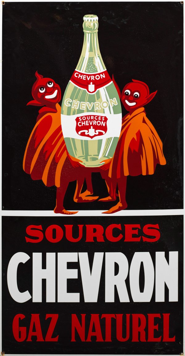 Emaille. Hochrechteckige Werbetafel für "Sources Chevron - Gaz Naturel". Polychrome Darstellung zweier diabolischer Figuren, die eine Flasche des Quellwassers tragen. Verso bez. "Limited Edition No. 4". 129 cm x 68 cm.