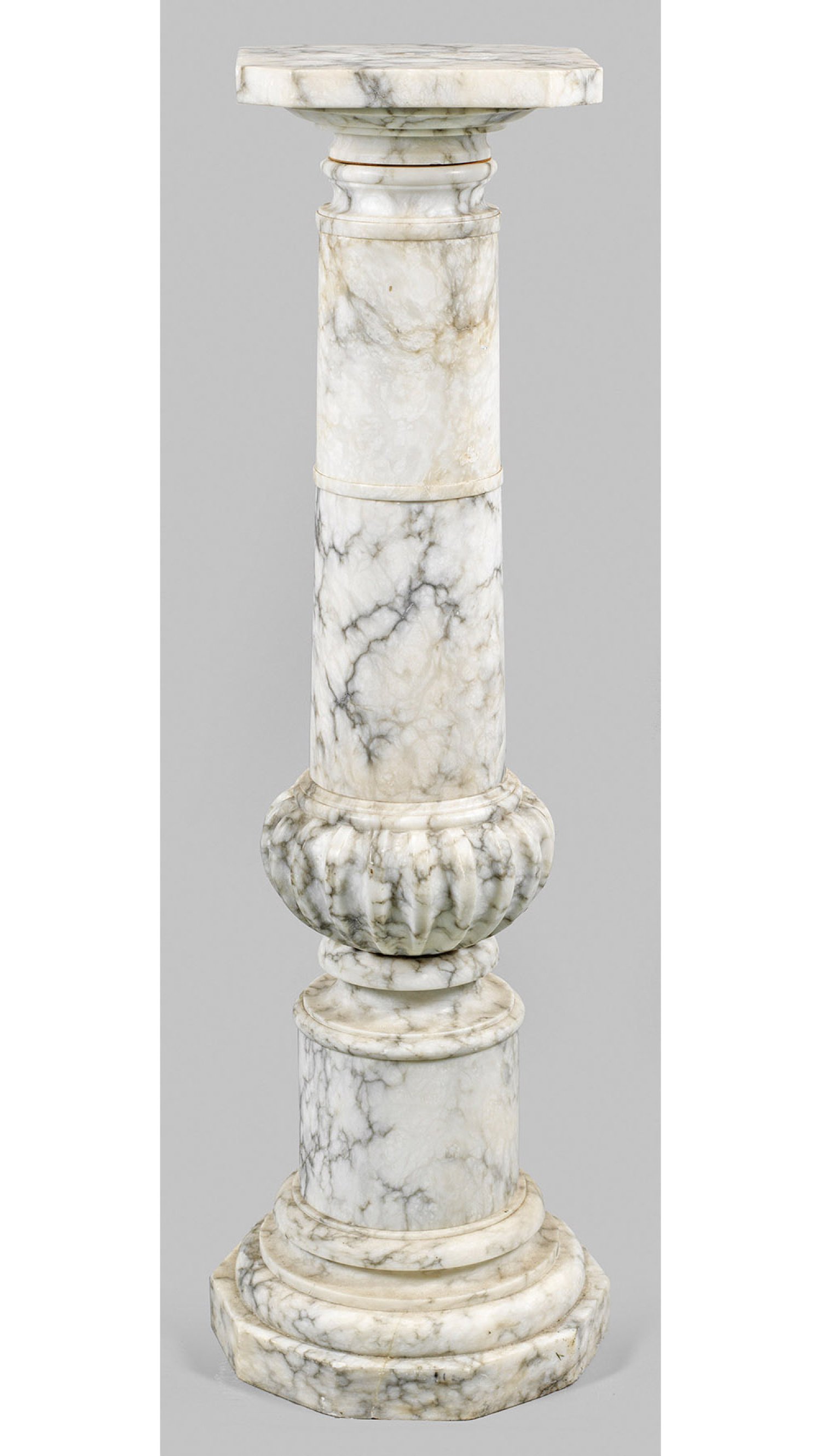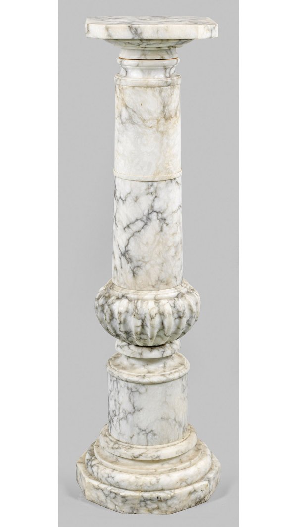 Weißer. hellgrau gemaserter Alabaster. Über polygonaler Sockelplatte mehrfach gegliederter Säulenschaft als Träger für quadratische, drehbare Deckplatte mit angeschrägten Ecken. H. 113 cm. 28,5 cm x 28,5 cm.