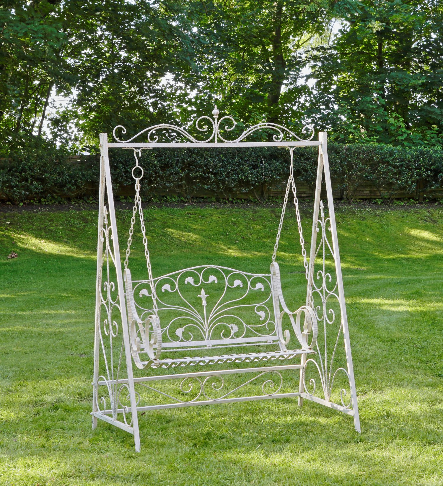 Metall, weiß lackiert. Offen gestaltetes Gestell aus schräggestellten Streben sowie eingerollten Volutenmotiven, durch korrespondierende Stege verbunden. Schaukelelement aus gerundeter Sitzfläche und gewölbter Rückenlehnenrahmung an Kettengliedern. H. 188 cm. 145 cm x 93 cm.