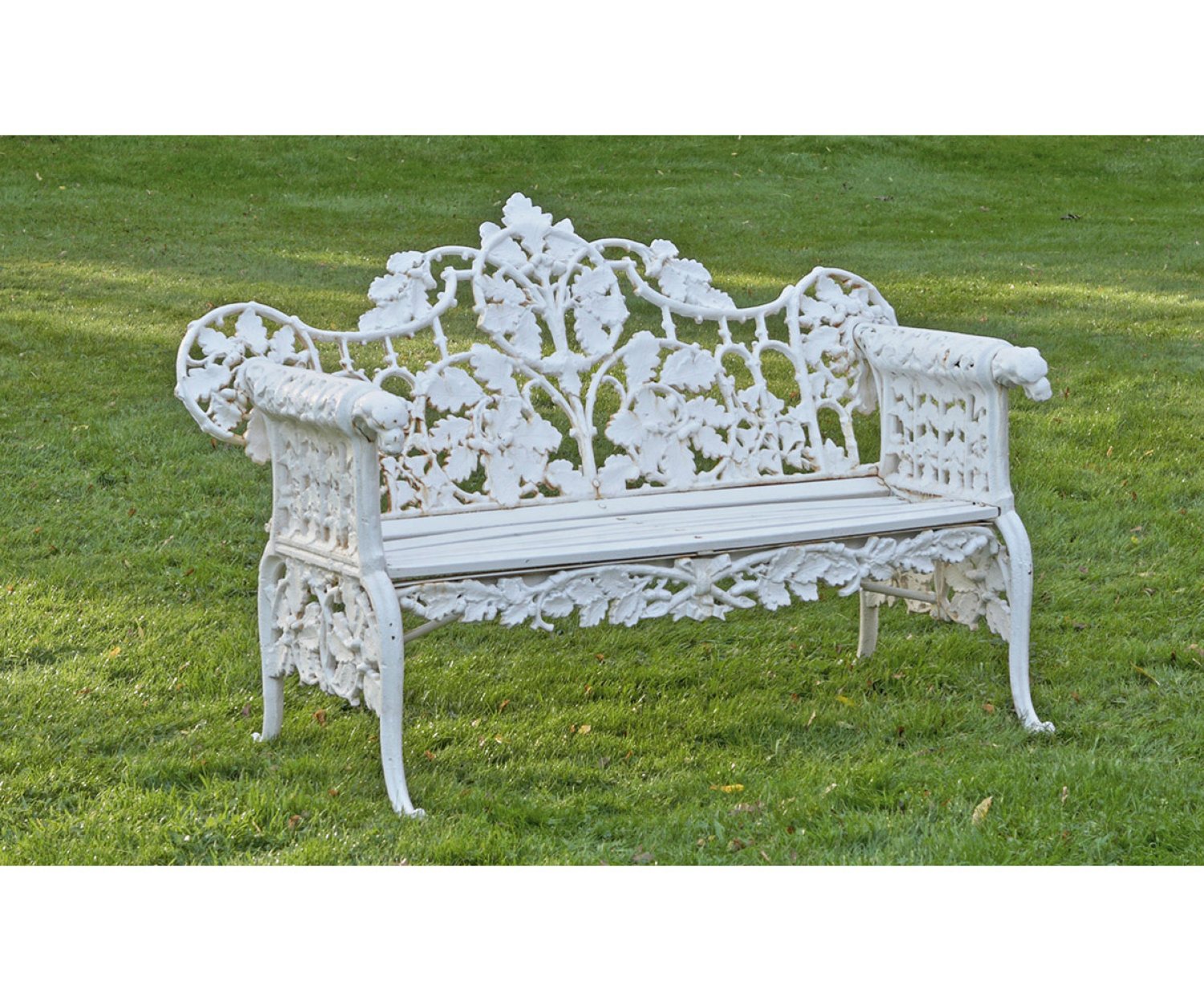 Gusseisen und Holz, weiß lackiert. Durchbrochen gearbeitete Zarge auf schlanken Volutenbeinen. Gerundete Armlehnen mit vollplastisch gestalteten Löwenköpfen. Stark geschwungene, durchbrochen gearbeitete Rückenlehnenrahmung aus üppigen Blattvoluten mit Eichenlaub und hochgewölbtem oberen Abschluss. H. 96 cm. 150 cm x 64 cm. Sitz-H. 43 cm.