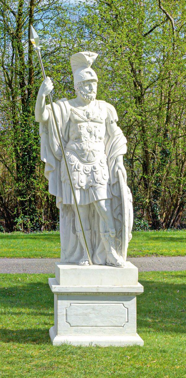 Weißgrauer Marmor. Der römische Kriegsgott wird in voller Rüstung dargestellt, er trägt einen Muskelpanzer mit Pteryges, Mantel, Beinschienen und einen reich verzierten Helm, hält mit der linken Hand ein Schild, die rechte Hand erhoben für einen Speer. Vollplastische, große Skulptur nach dem berühmten, monumentalen, römischen Original, ausgestellt in den Kapitolinischen Museen in Rom (Inv.-Nr. 58). Diese stammt höchstwahrscheinlich aus dem frühen 2. Jh. n. Chr. und wurde im 16. Jh. in den Ruinen des Nerva-Forums (auch Forum Transitorium) in Rom gefunden. 1738 erwarb Papst Clemens XII. die Skulptur, ließ sie ergänzen, so dass sie seit 1740 in den Museen ausgestellt ist. Helm ger. best.; Skulpturen-H. ca. 208 cm; Sockel-H. ca. 55 cm; Ges.-H. ca. 263 cm.