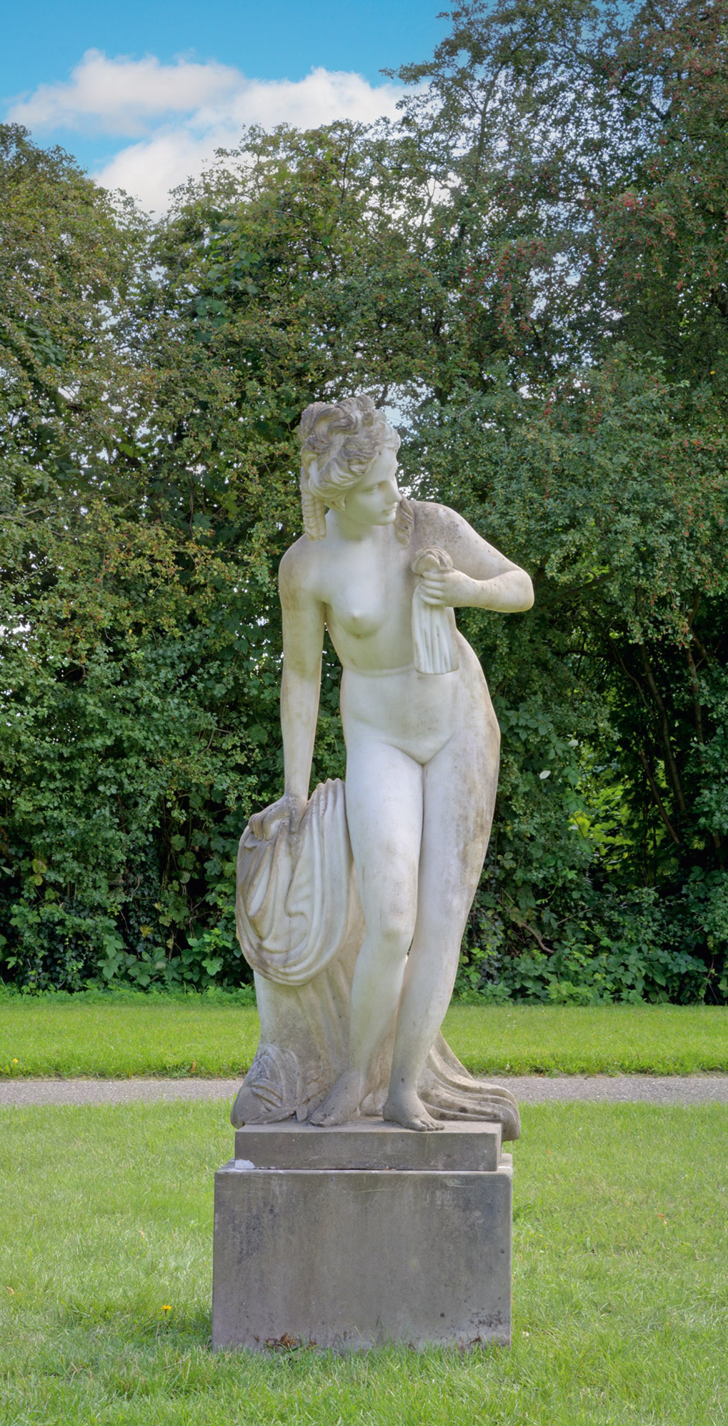 Weißer Marmor. Annähernd lebensgroße, vollplastisch gearbeitete, subtil ausgeführte, neoklassizistische Statue als Garten- bzw. Parkskulptur. Auf einer rechteckigen Plinthe stehender, weiblicher Akt einer jungen Frau in leicht vorgebeugter und geneigter Pose, die in ihrer Händen Tücher hält. Quadratischer, annähernd kubischer Sockel. Skulpturen-H. ca. 160,5 cm; Sockel-H. ca. 40,5 cm; Ges-H. ca. 201 cm.