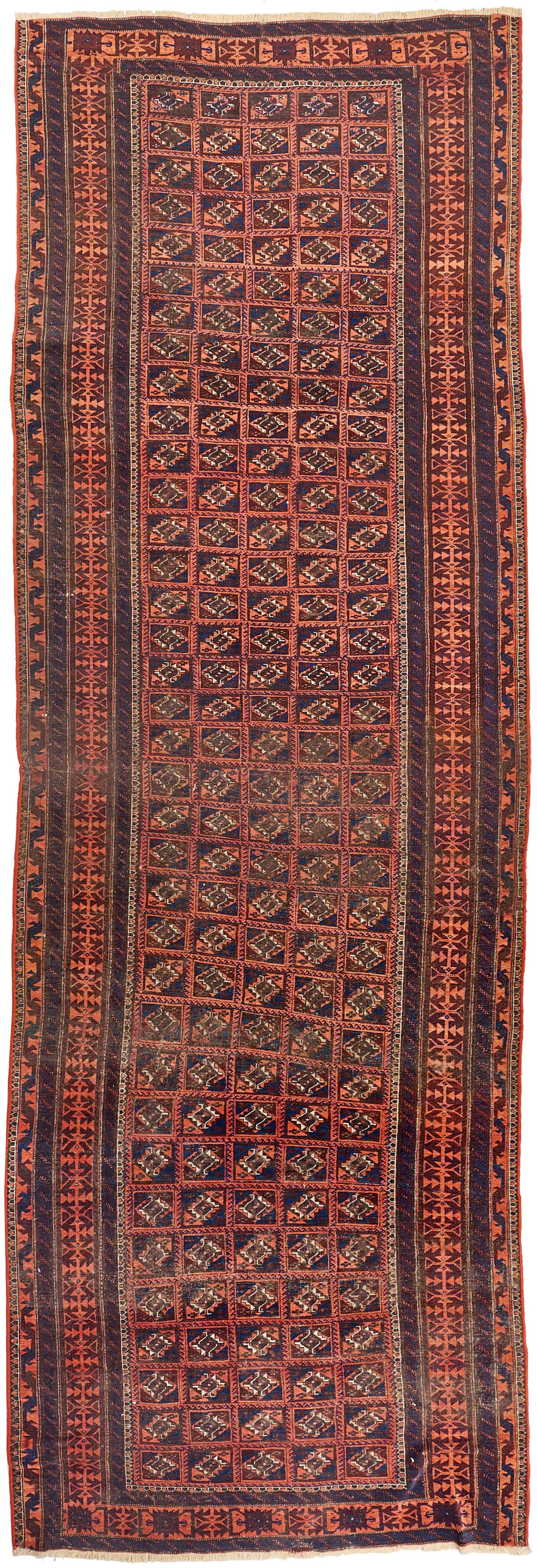 Persien. 1. Hälfte 20. Jh.; Wolle auf Wolle. Im rotbraunen Innenfeld flächendeckend dichte Feldermusterung mit Gölmotiven im Rapport, begrenzt von schmalen Bändern. Umlaufend breite, mehrteilige Ornamentbordüre mit Orangetönen. 450 cm x 150 cm.