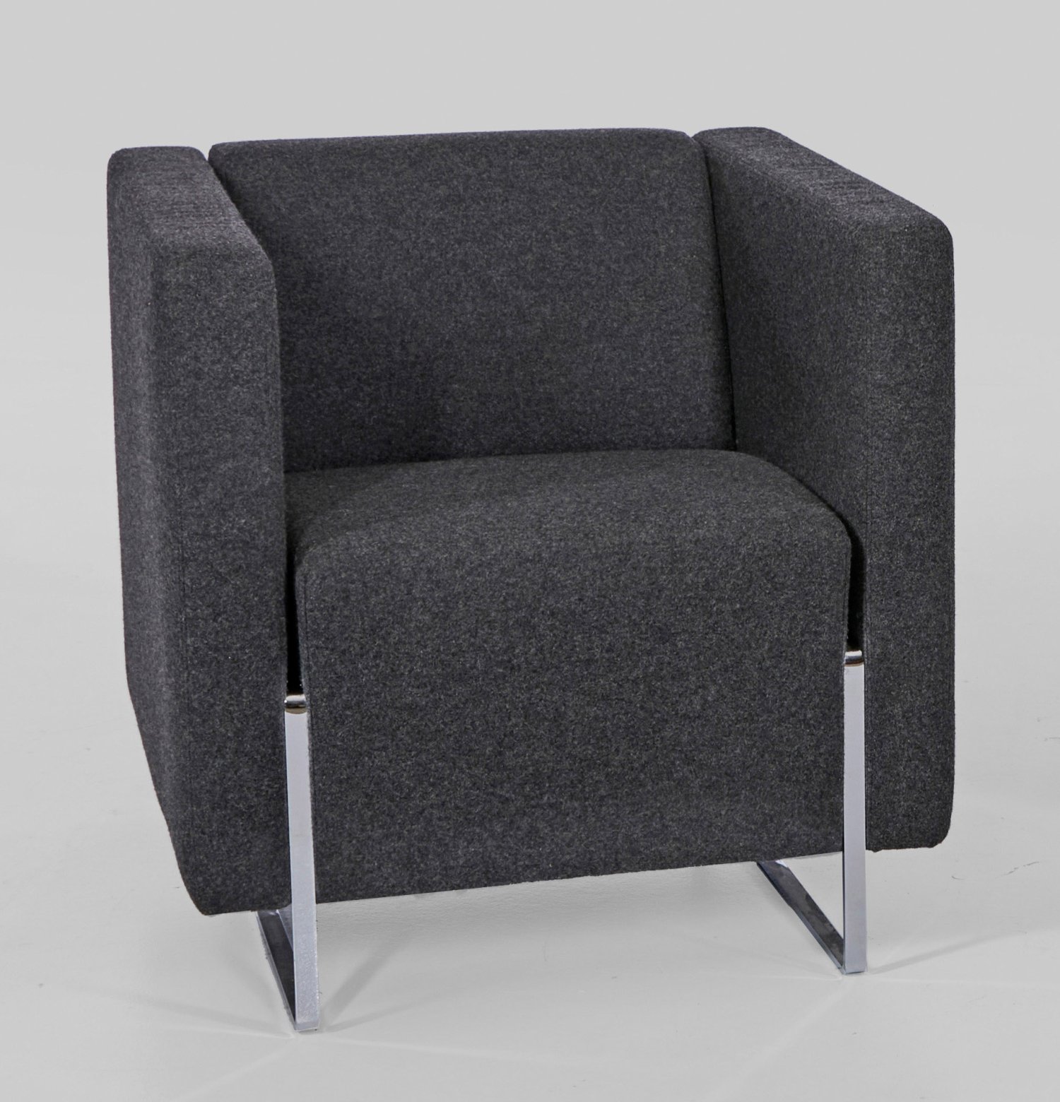 Verchromter Stahl und anthrazitfarbener Filz. Über schmalen, gekanteten Kufen kubenartiger Korpus mit schmalen Armlehnen und innen schräggestellter Rückenlehne. Herstellerzeichen. H. 70 cm. 68 cm x 68 cm. Sitz-H. 44 cm.