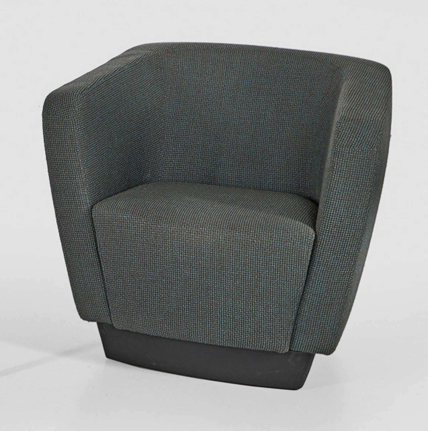 Sockel aus schwarzem Faserverband. Über sich konisch weitender Basis entsprechender Sesselkubus mit breiten Lehnen und abgerundeten Ecken. Allseitig gepolstert und bezogen. Entw. Hannes Wettstein. Herstellerzeichen. H. 71 cm. 80 cm x 90 cm.
