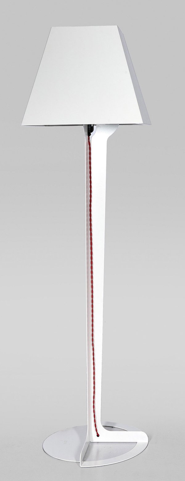 1-flg.; Pulverbeschichteter Stahl in Weiß. Flache, durchbrochen gearbeitete Basis, davon ausgehend abgekanteter Schaft als Träger für konischen Lampenschirm. Rotes Stoffkabel. Elektrifiziert. Herstellerzeichen. Entw. Alexander Taylor. H. 155 cm.