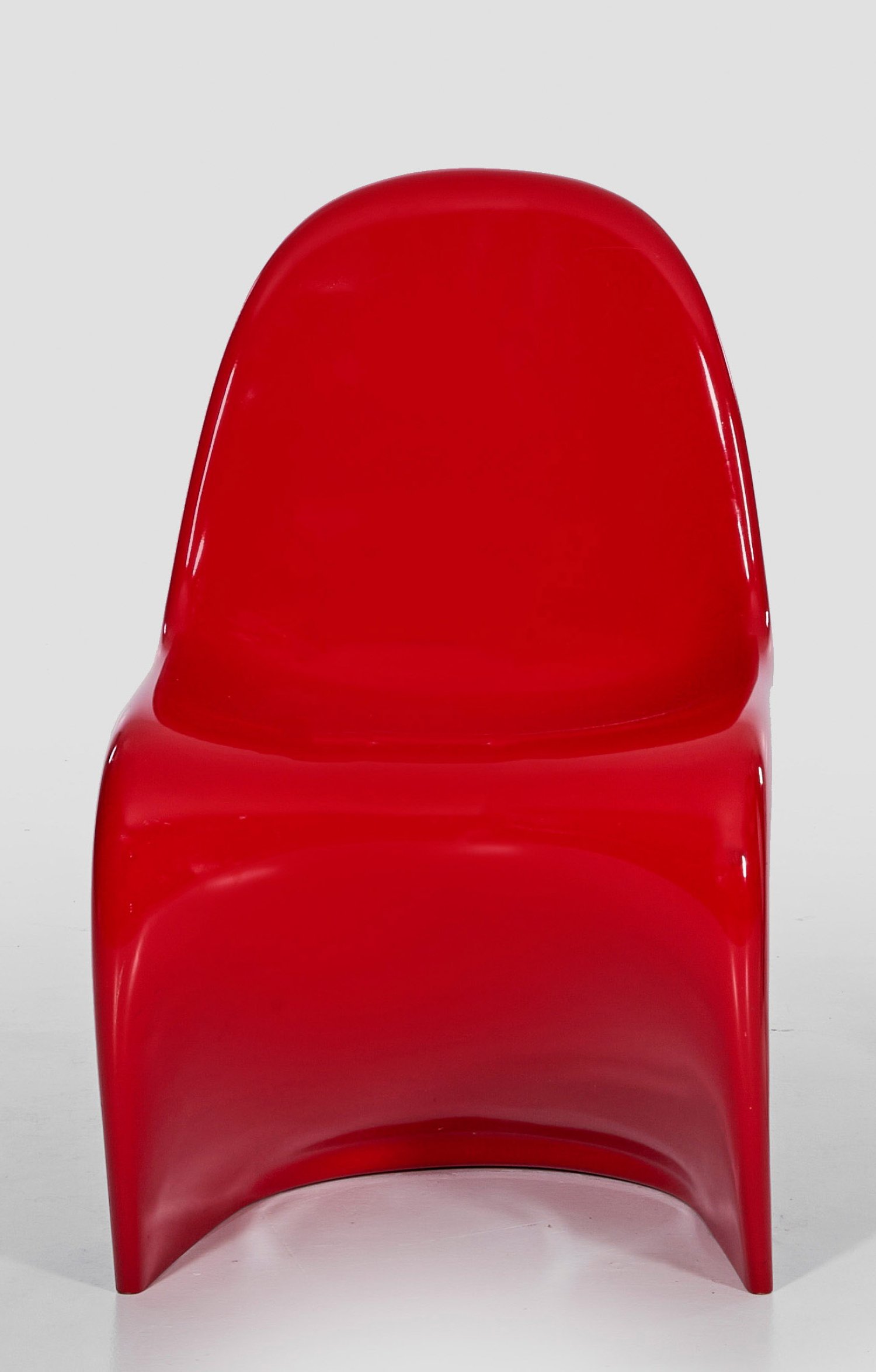 sog. Panton-Chair. Fester kirschrot lackierter Polyurethanschaumstoff. Organisch geformtes, freischwingendes Gestell. Etikett Herman Miller Collection. Entw. Verner Panton, 1967. H. 81 cm. 49 cm x 58 cm. Sitz-H. 42 cm.