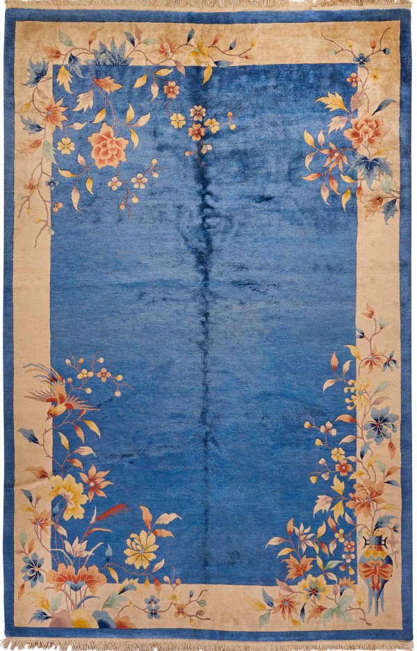 China. Wolle auf Baumwolle. Hellblaues, monochromes Innenfeld sowie umlaufend breite, cremefarbene Bordüre mit großzügig angelegter Musterung aus üppigen Blütenzweigen, Vase und Phönix. 285 cm x 192 cm.