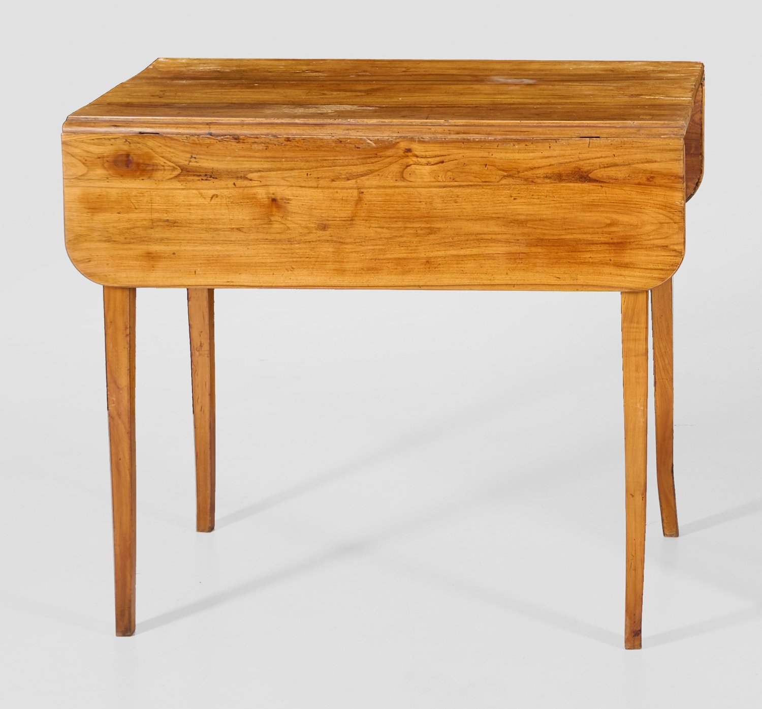 Kirschbaum, massiv und furniert. Gerader, einschübiger Zargenkasten auf konischen Vierkantbeinen. Seitlich aufstellbare Deckplatte mit gerundeten Ecken. Gebrauchsspuren. H. 76 cm. 87 cm x 45,5/86 cm.