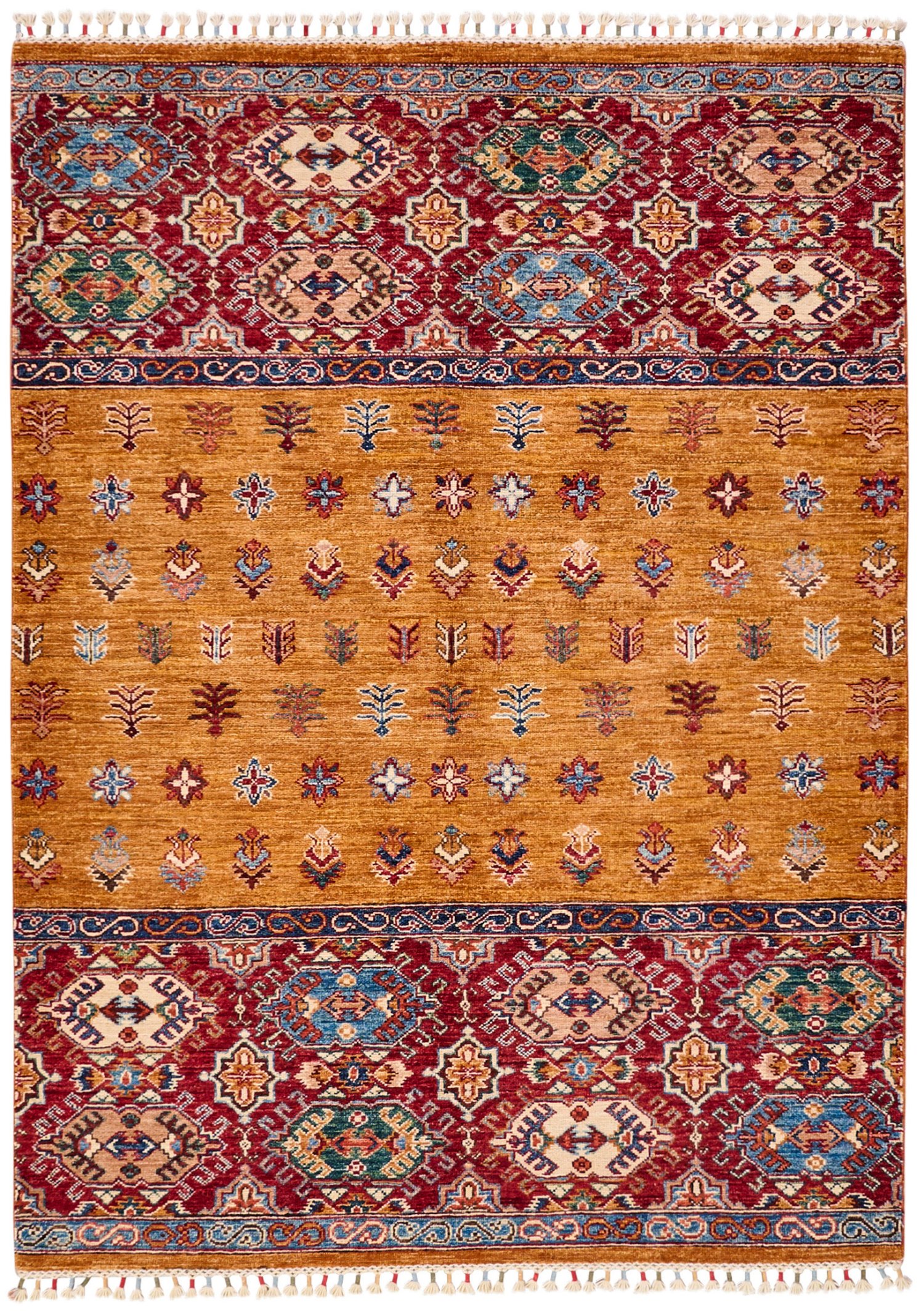 Afghanistan. Wolle auf Baumwolle. Naturfarben. Flächendeckende, in unterschiedlichen Rot- und Safrantönen abraschierte Schalmusterung aus breiten Streifen mit gereihten Palmetten im Rapport bzw. Kartuschenmotiven, begrenzt von ornamentierten Borten. 182 cm x 132 cm.