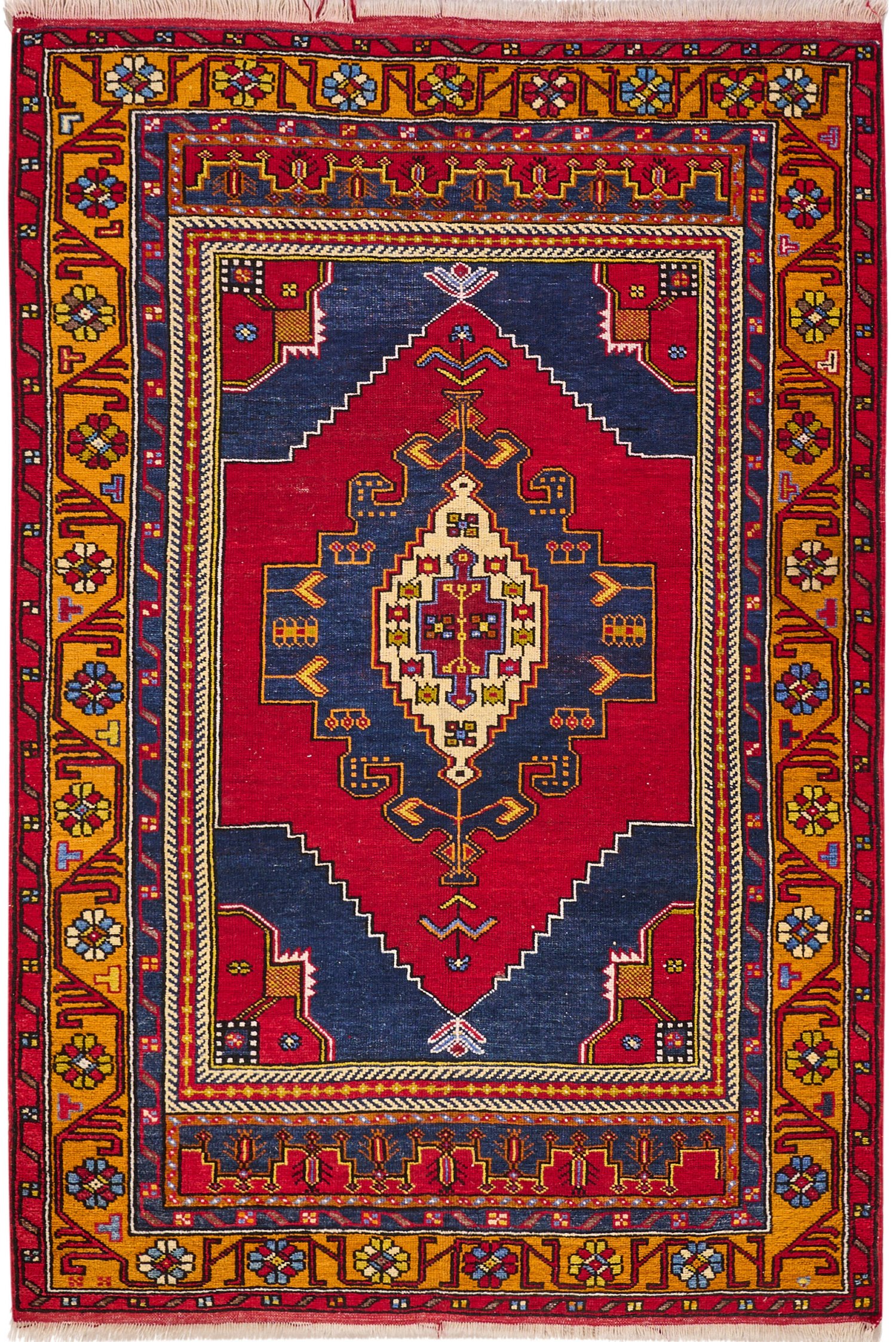 Türkei. Wolle auf Wolle. Auf blauem Fond große, rotgrundige Reserve mit blauem Kartuschenmedaillon. Umlaufend breite, safranfarbene Bordüre aus stilisierten Ranken, begrenzt von Wellenbändern. 180 cm x 120 cm.