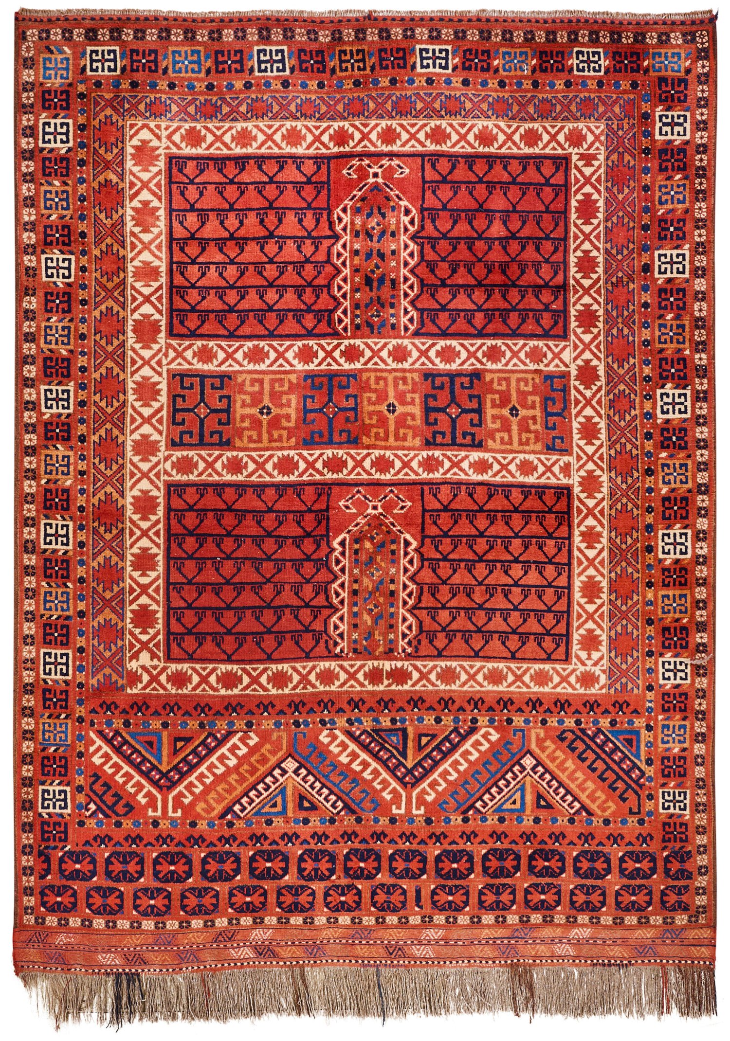 Afghanistan. Wolle auf Wolle. Im rostroten Innenfeld rechteckige Reserve mit Rapportmuster. Umlaufend breite, vielteilige Ornamentbordüre. 215 cm x 163 cm.