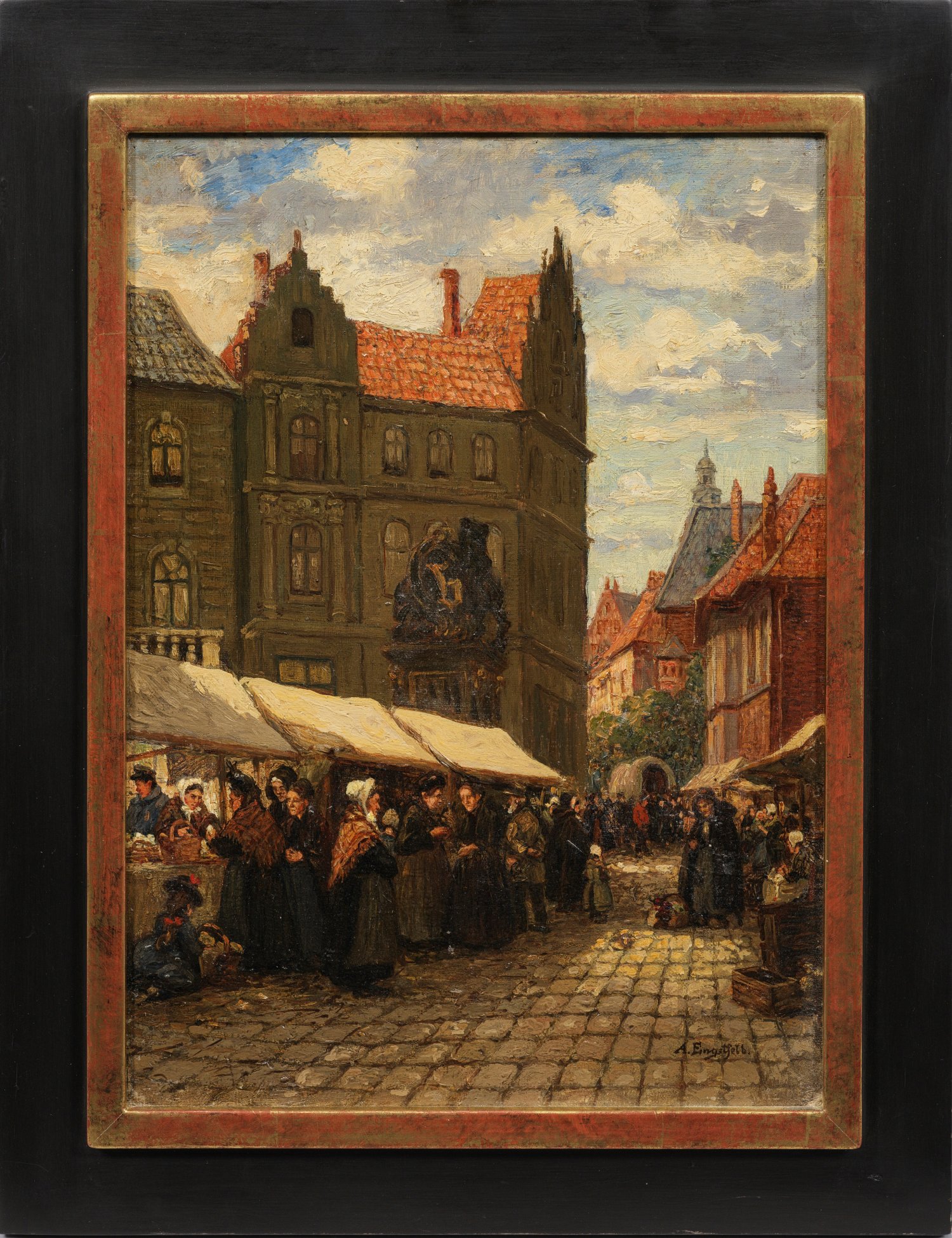 Blick auf einen mit historischen Häusern eingefassten Platz mit lebendig geschilderter Wochenmarktszene aus aufgereihten Marktständen mit davor versammelten zahlreichen Frauen und wenigen Männern. Im Hintergrund ein Denkmal auf einem hohen Sockel. Mit schnellem, breitem, stellenweise pastosem Farbauftrag in kräftigen Tönen eingefangene Stadtansicht Engstfelds, in der er Stilelemente des Realismus und Spätimpressionismus verbindet, wohl entstanden in seiner künstlerischen Reifephase vor 1914. Engstfeld studierte 1892-1896 an der Düsseldorfer Akademie bei Peter Janssen und Arthur Kampf, danach bereiste er öfters die Niederlande (u. a. Sluis) und lebte 1908-1914 in Brügge. Seit 1903/04 beschickte er zahlreiche bedeutende Ausstellungen, in Düsseldorf, Berlin, Dresden und anderen Städten. Öl/Malkarton. R. u. sign.; 38,5 cm x 28 cm.