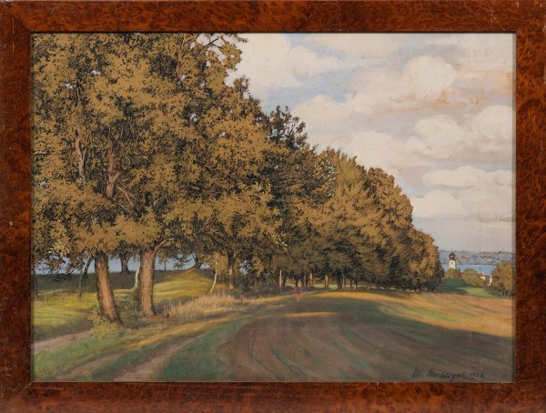 Heitere, mit subtiler Licht- und Schattenführung geschaffene Landschaft, dominiert von einer langgezogenen Reihe hochgewachsener Eichen, perspektivisch auf einen Kirchturm an einem Seeufer zulaufend, vermutlich dem Starnberger See. Die schlesische Künstlerin Maria Nachtigal war in Weimar und München tätig und trat überwiegend als Graphikerin in Erscheinung. Gouache und Tusche/Papier. R. u. sign. und dat. 1918. Verso mit diversen Beschriftungen. Ca. 46,4 cm x 63 cm. Rahmen.