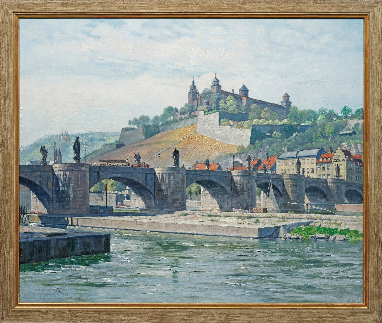 Blick über den Main mit der Alten Mainbrücke auf die Festung Marienberg. Großformatige, frühlingshaft gestimmte Vedute, welche die Stadt vor den Zerstörungen im II. Weltkrieg zeigt. Öl/Lwd.; L. u. sign. u. dat. 1933 mit Ortsangabe Würzburg. Ger. Läsuren. 96 cm x 118 cm. Rahmen.
