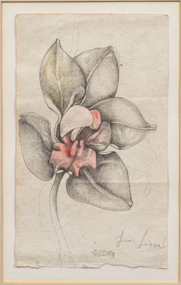 Mit feinem, subtil naturnahem Strich gezeichnete Blütenstudie mit zarter Kolorierung. Aquarellierte Bleistiftzeichnung/Bütten. Sign. u. bez. "Für Liesa!". Ca. 20,8 cm x 12,5 cm. Rahmen.