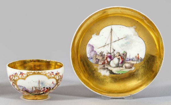 A porcelain tea bowl and saucer finely painted with Kauffahrtei scenes. Former's no. for P. Geithner resp. C. Meynert. Gold letter Z. Saucer probably added. Rubbed. Crossed swords mark.