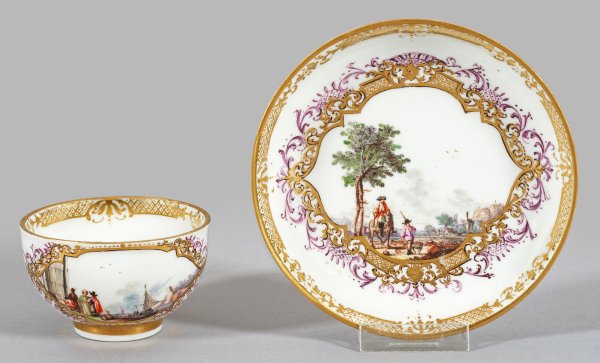auf Unterschale. Auf kurzem Standring halbkugeliger Korpus. Beidseitig der Wandung ornamentierte, von purpurfarbenem Laub- und Bandelwerk umzogene Goldornamentreserven. Darin Hafenszene mit europäischem und orientalischem Kaufmann im Gespräch bzw. baumbestandene Landschaft mit Reiter und Begleitfiguren, u. a. mit Blick auf das Elbsandsteingebirge. Im Spiegel des Koppchens ein von eisenroter Doppelringlinie gerahmtes Medaillon mit Kauffahrteiszene, zwei Segelschiffe darstellend. Wandung und Schalenunterseite mit farbenfrohen, ombrierten Holzschnittblumen, gestreuten Blüten und Insekten. Feine polychrome Malerei mit reichem Golddekor. Umlaufende Ornamentbordüre aus stilisierten Ranken und Gitterwerk. Gold-Nr. 15. Schwertermarke. H. 4 cm.