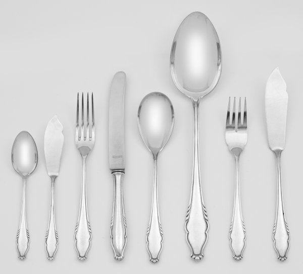 Silber. 52-tlg.; 12 Speisemesser, 12 -gabeln, 6 Fischmesser, 6 -gabeln, 12 Teelöffel, 4 Vorlegeteile u. a. Vorlegelöffel und Buttermesser. Konisches, randprofiliertes Heft. Edelstahlklingen. Gest. 800, Herstellerzeichen. Gew. zus. ca. 2255 g (Gew. ohne gefüllte Teile ca. 1650 g).