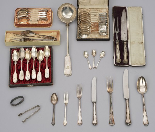 A German mixed 81-piece silver and plated cutlery. Partly monogrammed. 3 pieces with cracks. Standard mark 800, different maker´s marks.Deutsch. 1. Hälfte 20. Jh.