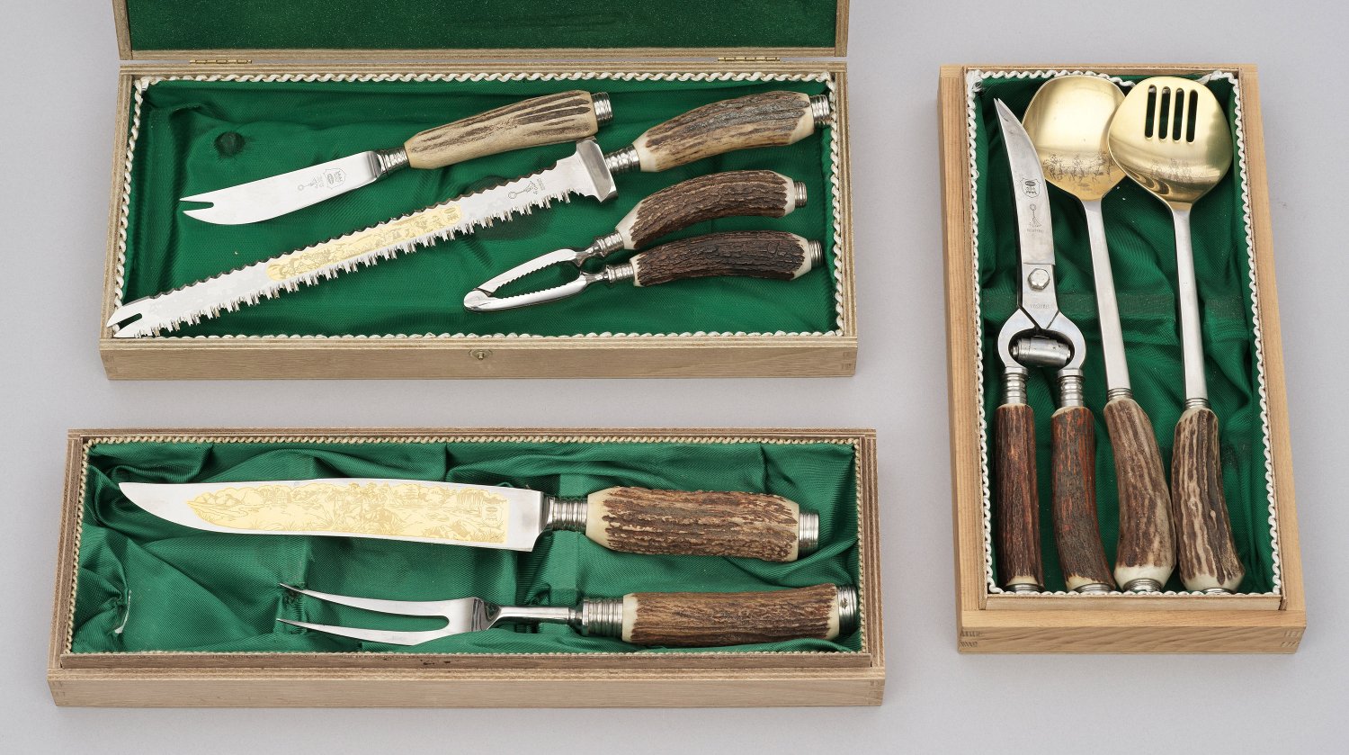 8-tlg.; Geflügelschere, Nussknacker, Vorlegebesteck, Tranchiermesser, -gabel, Fleischmesser, Messer mit doppelseitiger Sägeklinge. Die Griffe aus teilw. geschliffenem, naturbelassenem Rehgehörn, endend in Scheibenknäufen aus Edelstahl. Klingen bzw. Laffen aus Edelstahl. Gest.; Wicküler-Küpper-Brauerei. Teilw. Original-Boxen. L. 17 cm - 36 cm.