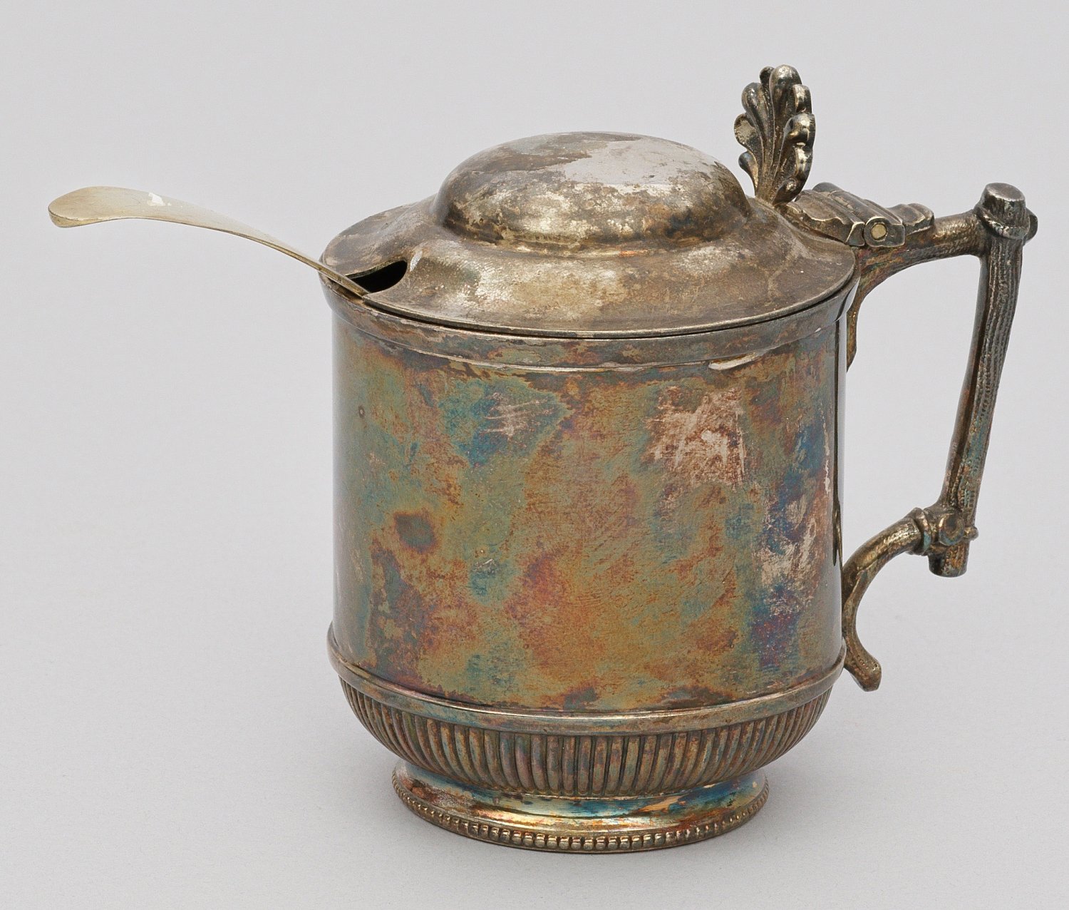 Silber mit kobaltblauem Glaseinsatz. Auf perlstabumzogenen, eingezogenen Standring fein godronierter Fuß. Glatter, zylindrischer Korpus mit scharniertem, mittig aufgewölbten Deckel. Ohrenhenkel in Form zusammengebundener Zweige, muschelförmige Daumenrast. Löffel mit runder Laffe und konischem Griff. Unidentifiziert gest.; Gew. zus. ohne Glaseinsatz ca. 165 g. H. 9 cm - 11 cm. D. 2,5 - 6,5 cm
