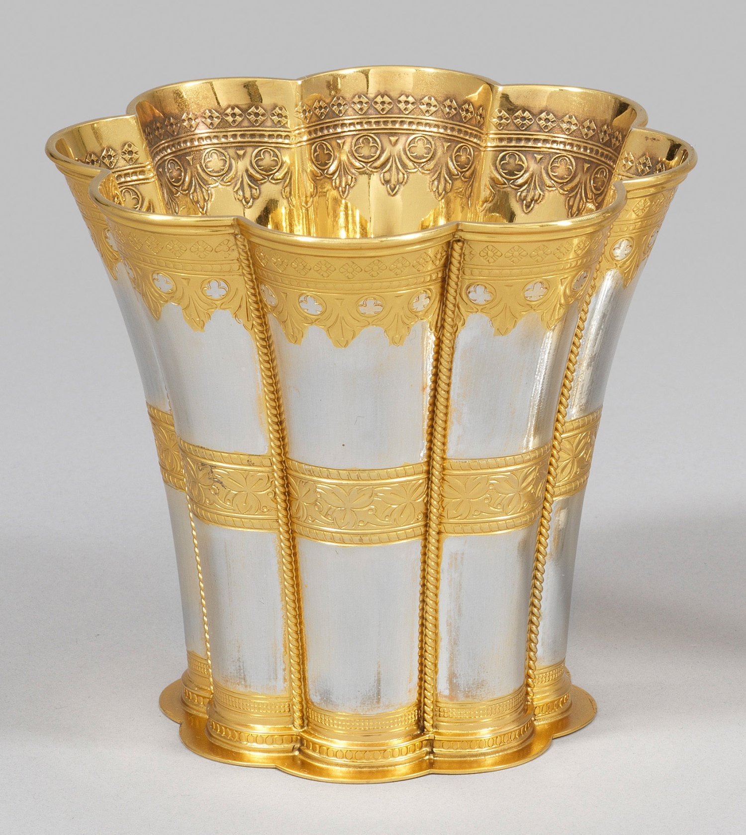 Sterlingsilber. Achtpassig geschweifter, konisch ausschwingender Korpus mit profiliertem Lippenrand. Durch drei von Kordelbändern gerahmte Zierfriese gegliederte Wandung. Innen vergoldet. Gest. Sterling Denmark, Herstellerzeichen. Gew. ca. 355 g. H. 11,5 cm. D. 13 cm.