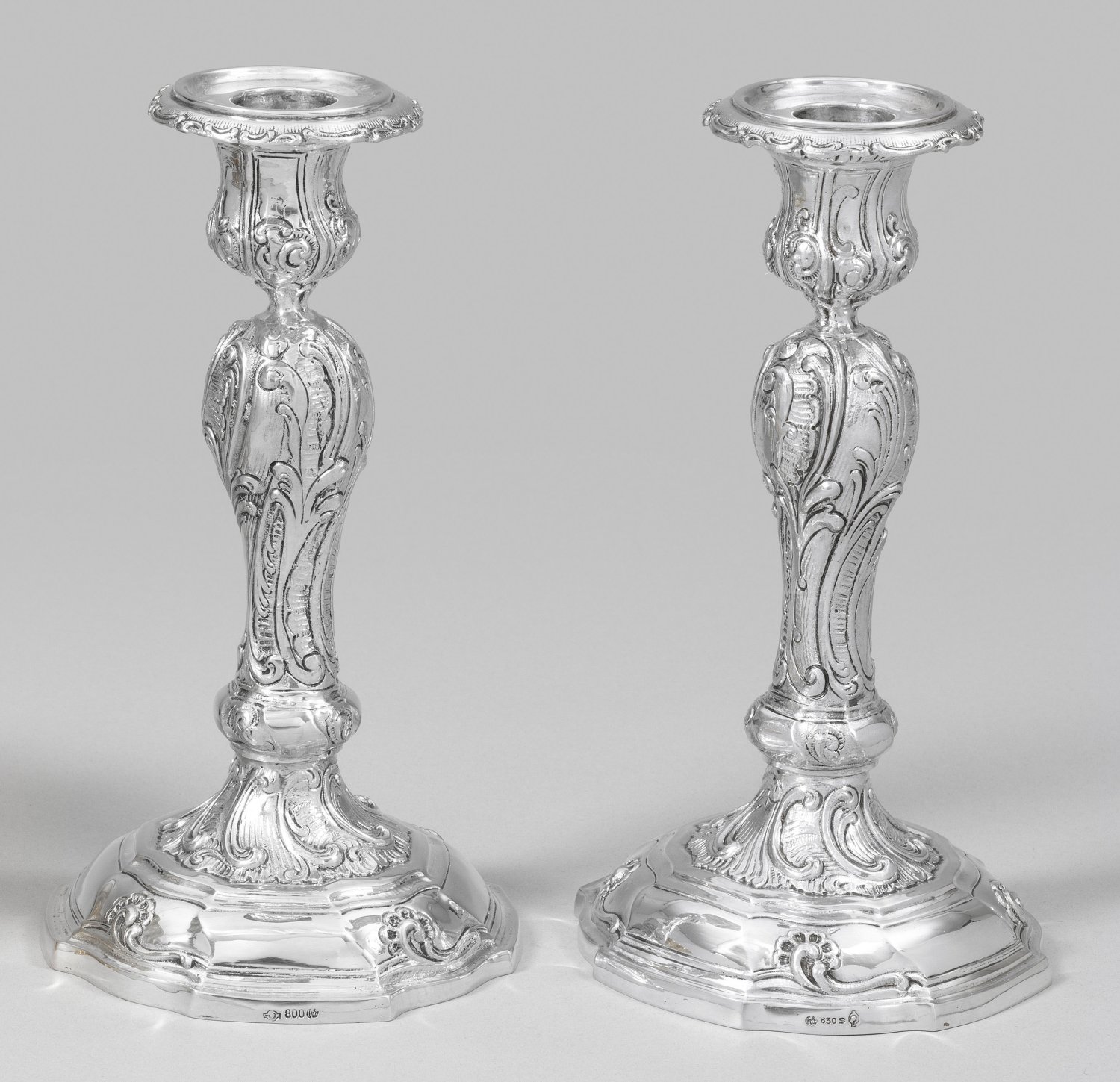 A pair of German Frederician style silver candlesticks. Standard mark 830. Assay- and maker´s mark.