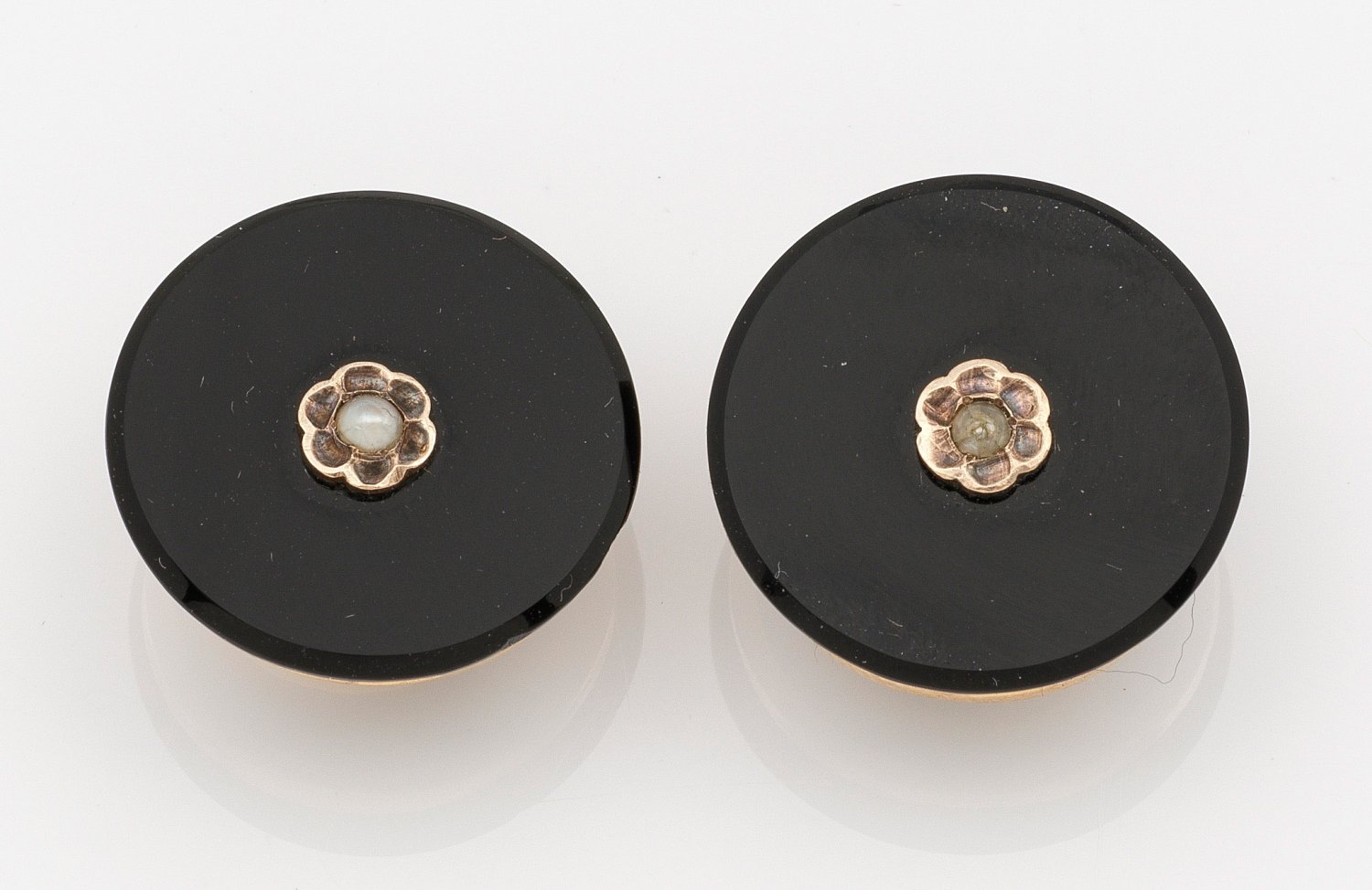 Frankreich. Gelbgold, gest. 18 k (Merkurkopfpunze). Zentral besetzt mit Onyx und je einer kleinen, floral gefassten Saatperle. Patentstempel. Ges.-Gew. ca. 9,17 g.