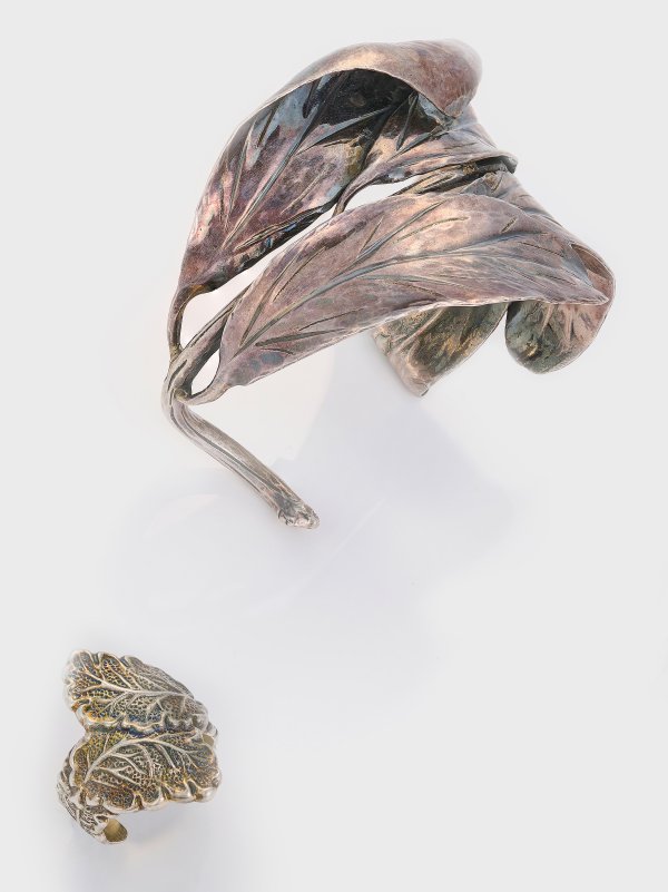Armreif und korrespondierender Ring. Sterlingsilber, gest. 925. Naturalistisch reliefplastisch gearbeitete Blattranke als Armreif sowie Ring. Herstellerzeichen. Ges.-Gew. ca. 62,67 g.