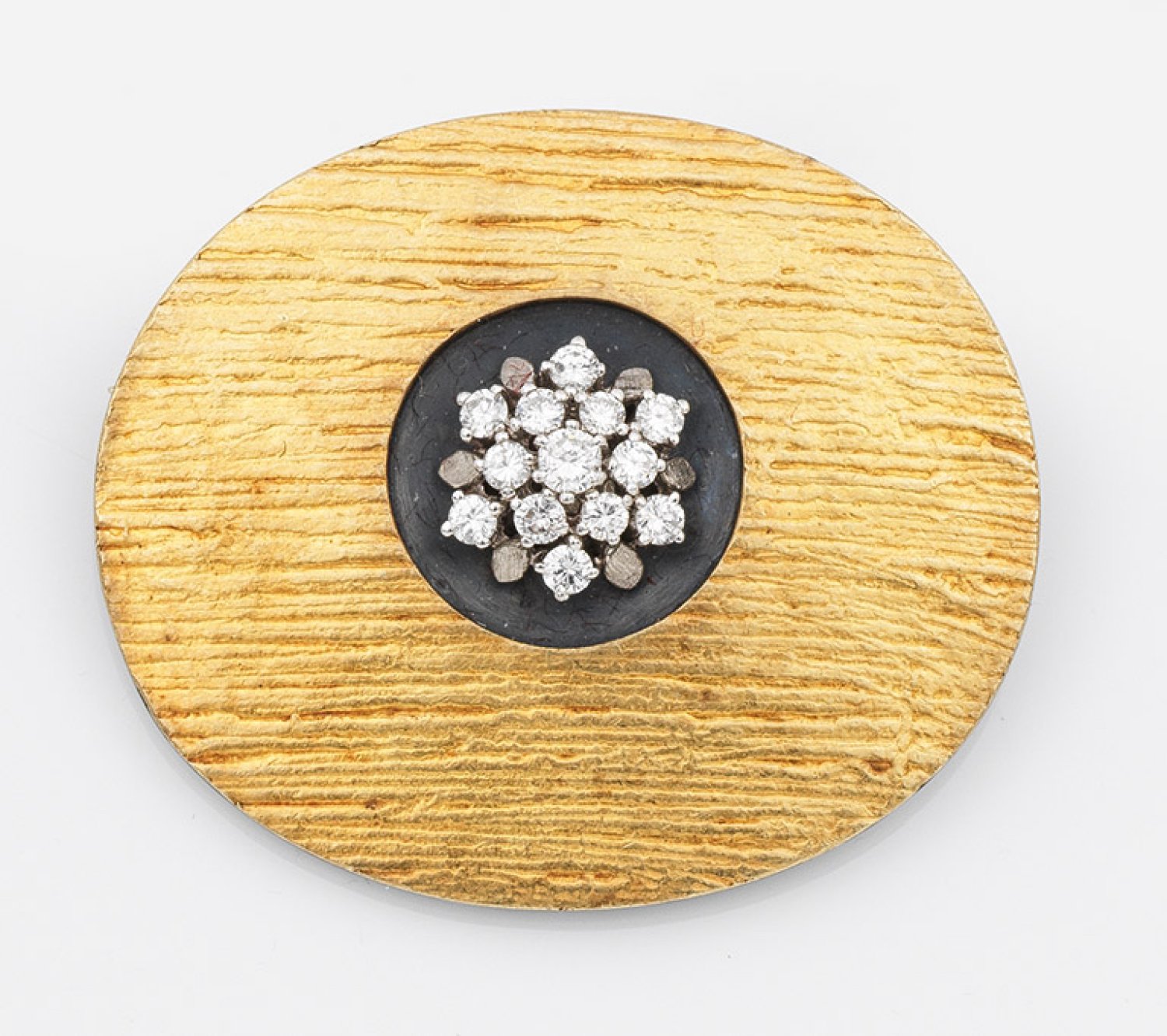 Sulfiertes Silber, gest. 925, und Feingold. Ovale Brosche mit geprägter Feingoldauflage, zentral besetzt mit Brillanten, blütenförmig gefasst. Herstellerzeichen. Gew. ca. 18,10 g.