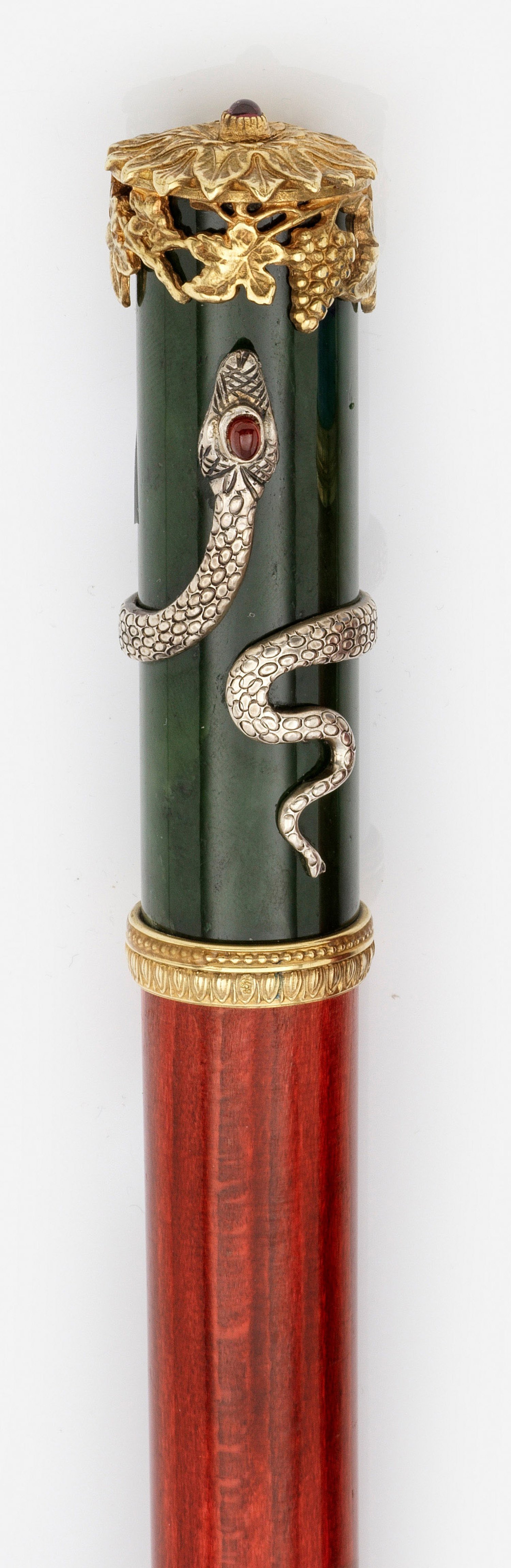 in der Art von Karl Fabergé. Nephrit, Silber, teilw. vergoldet und rot lasiertes Holz. Der zylindrische Griff, umwunden von einer silbernen Schlange. Leicht gerundeter Abschluss verziert mit Blattrosette und Weinlaubfries, zentral besetzt mit Farbsteincabochon. Gest. 88, Meistermarke. L. 93,5 cm.