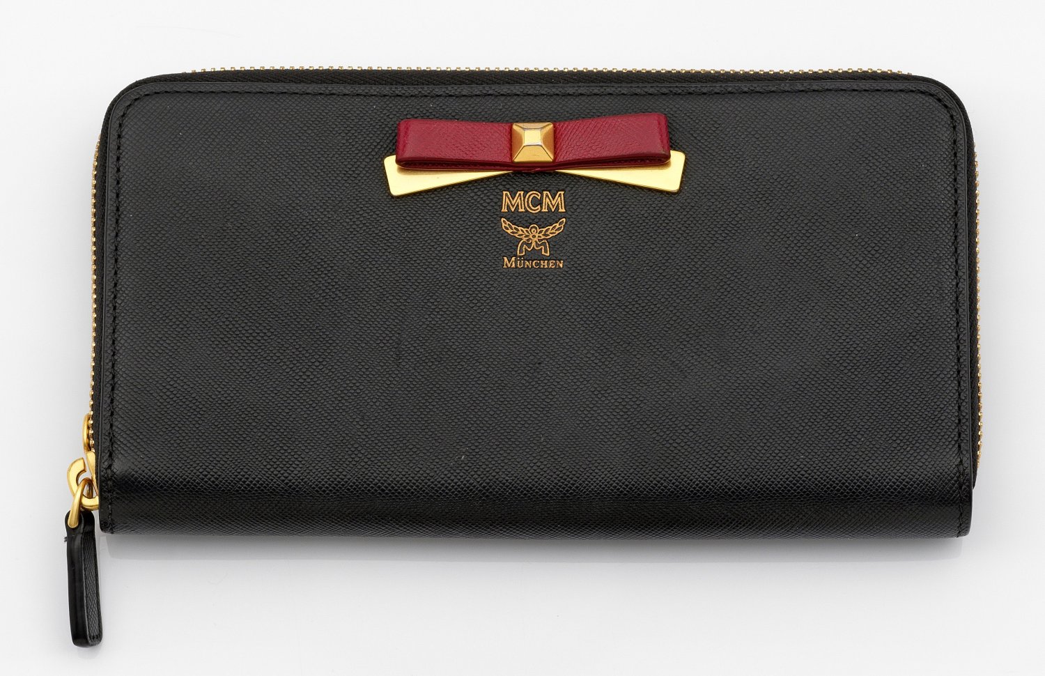 Schwarzes und magentafarbenes, fein strukturiertes Leder und vergoldete Hardware. Rechteckiger Korpus mit appliziertem Schleifenmotiv und Reißverschluss. Innen reiche Facheinteilung. Herstellerzeichen. H. 2,5 cm. 10 cm x 19 cm.