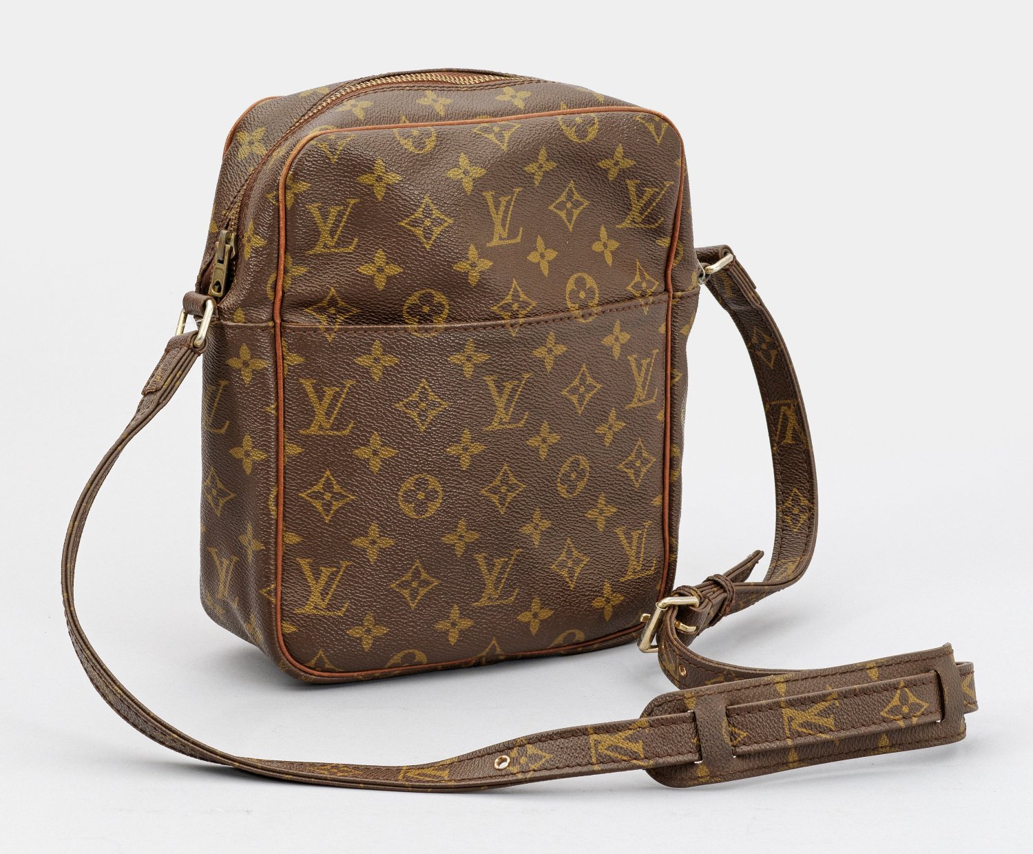 Monogram-Canvas und braunes Leder. Rechteckiger Korpus mit Schultergurt sowie großem Haupt- und schauseitig flachem Nebenfach. Herstellerzeichen. Alters- und Gebrauchsspuren. Besch.; H. 24 cm. 19 cm x 8 cm.
