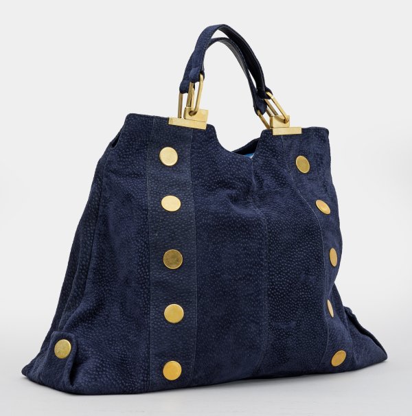 Blaues Wildleder und vergoldete Hardware. Flacher, konischer Korpus mit zwei Handhaben. Großes Hauptfach mit schmalen Nebenfächern. Herstellerzeichen. Seriennummer: 213659.467891. Taschen-H. 43 cm. 50 cm x 13 cm.