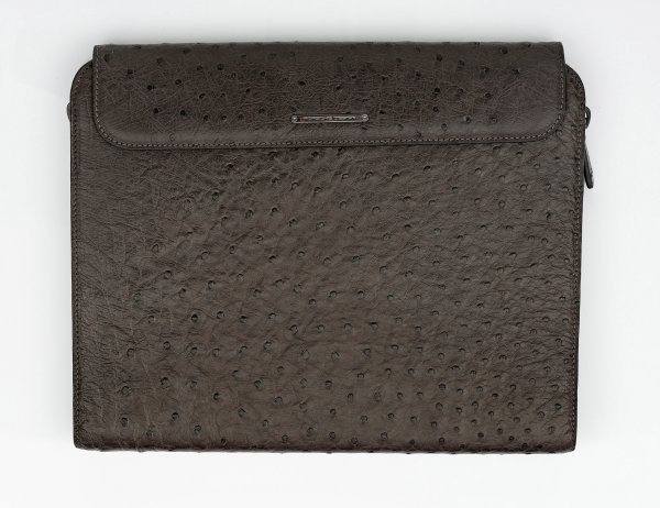 Anthrazitfarbenes Straußenleder. Flacher, rechteckiger Korpus mit seitlichen Reißverschlüssen sowie schmalem Überschlag. Innen gestaffelte Facheinteilung unterschiedlicher Größe sowie Halterung für Schreibgerät. Herstellerzeichen. Originaler Staubbeutel. Neuwertig. 33,5 cm x 27 cm.
