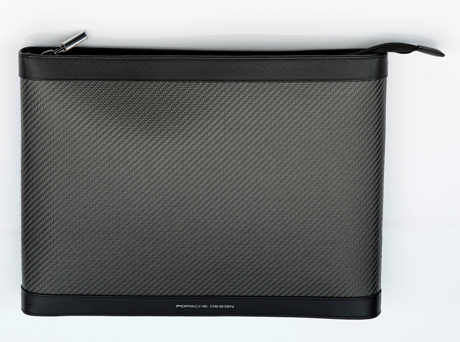 A dark grey carbon and black leather laptop case by Porsche Design. New condition. Original dust bag. Manufacturer's mark.