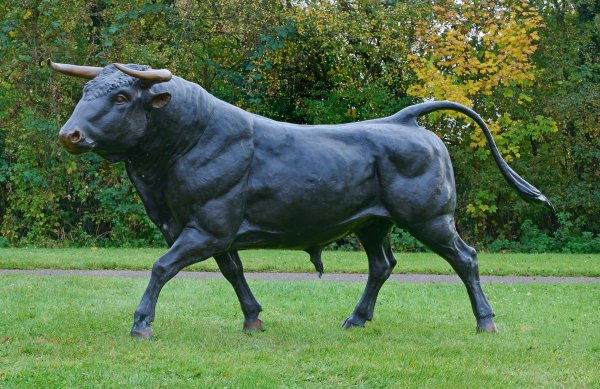 Bronze, dunkel patiniert, partiell poliert und goldbraun patiniert. Monumentale, lebensgroße, naturnahe, anatomisch getreue Darstellung eines laufenden Stieres mit erhobenem Kopf, das die schier ungebändigte Kraft des Tieres eindrucksvoll wiedergibt. Die teilw. fein ausgearbeiteten Details des Bullen und die zweifarbige Patinierung verstärken die Lebendigkeit. H. ca. 156,5 cm; B. ca. 320 cm.