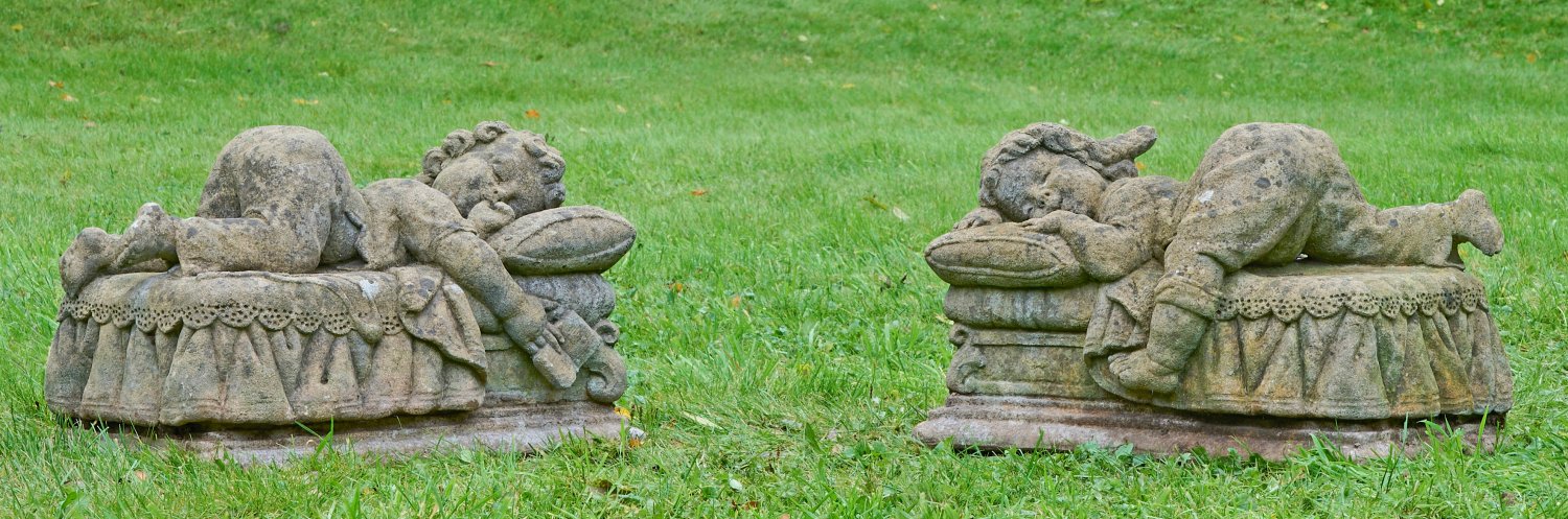 Gegenstücke. Steinguss. Vollplastische, dekorative Darstellungen eines Mädchens und eines Knaben als Garten- bzw. Parkskulpturen. H. ca. 40 cm, B. ca. 65 cm.