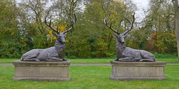 Gegenstücke. Bronze, dunkelbraun patiniert. In der Tradition des 19. Jhs. gestaltete, vollplastische, realistische, naturnahe Darstellungen zweier kapitaler Hirsche, den Kopf nach links bzw rechts wendend. Große, querrechteckige Sockel mit vorkragender Fuß- und Deckplatte, die Seiten kanneliert. Hirsche H. ca. 117 cm; Sockel ca. 67,5 cm x 190,5 cm x 70 cm