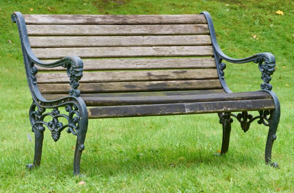 Gusseisen, schwarz lackiert und Holz. Geschwungene Seitenwangen aus verschlungenen Volutenmotiven. Korrespondierende Armlehnen mit plastischen Löwenmaskarons. Sitz- und Lehnenfläche aus dicht angeordneten Stegen. Altersspuren. H. 86 cm. 125 cm x 72 cm. Sitz-H. 46 cm.