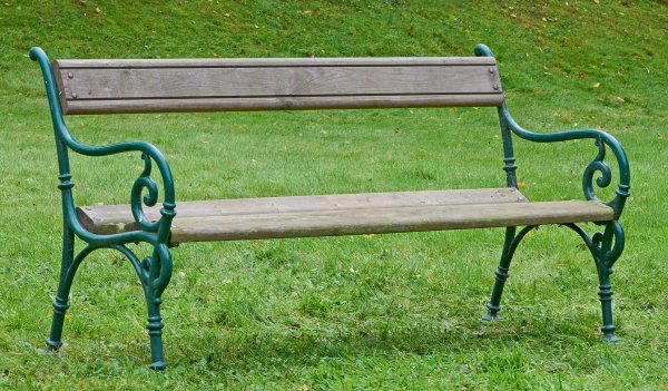 Gusseisen und Holz. Durchbrochen gearbeitete Seitenelemente aus geschwungenen und gegeneinander gestellten Voluten. Sitzfläche und Rückenlehne aus kräftigen Stegen. Altersspuren. H. 81 cm. 176 cm x 68 cm. Sitz-H. 39 cm.