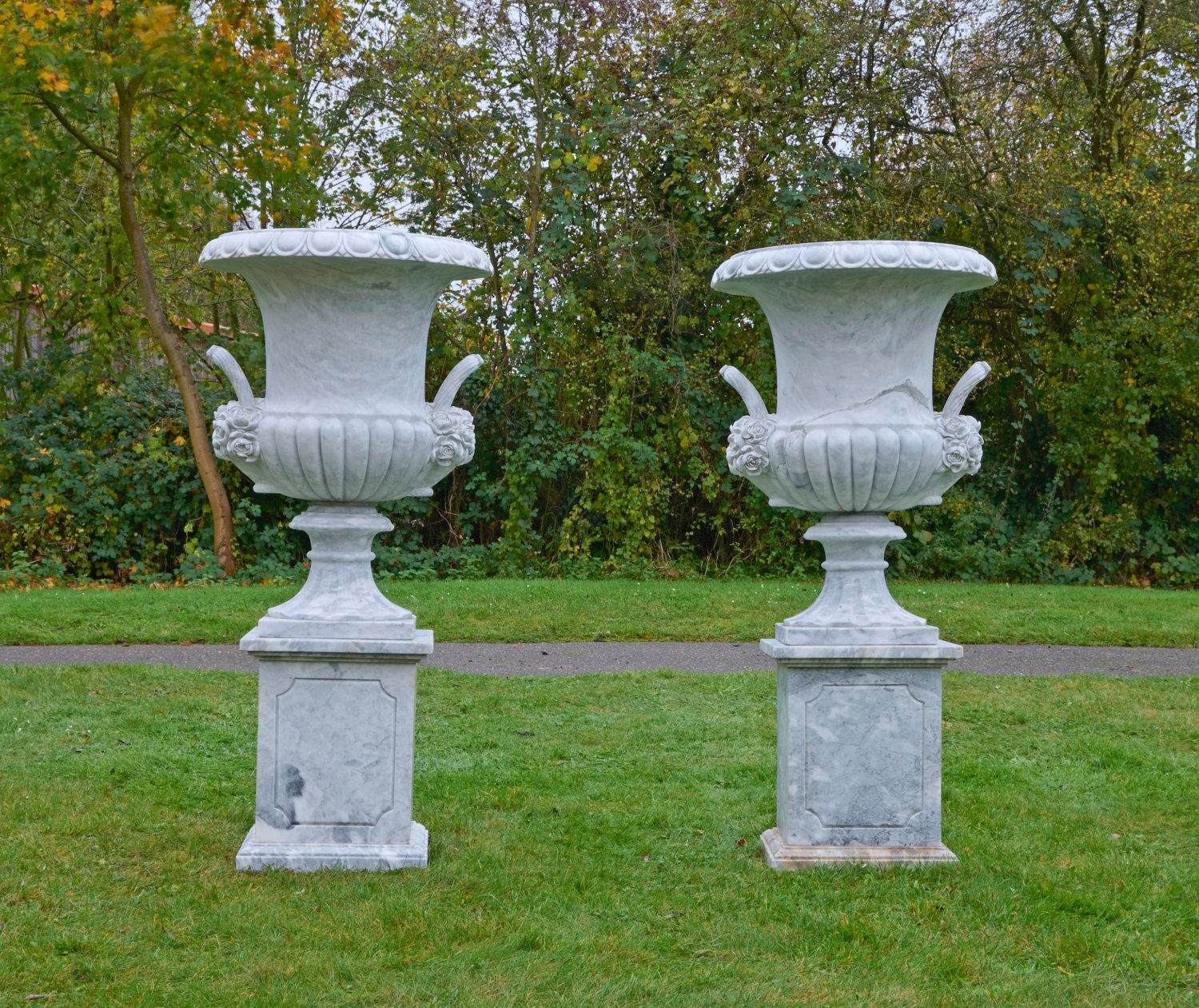 Weißer, hellgrau gemaserter Marmor. Balusterförmige Kratervasen mit teilw. kräftig godronierter Wandung sowie weit ausschwingendem Lippenrand aus breitem Eierstabfries. Seitlich vollplastisch ausgestaltete Arrangements aus Rosenblüten. Davon ausgehend geschwungene Bügelhenkel. Unterhalb hohe, korrespondierende Podestsockel mit reliefierten Reserven auf schmal profilierter Plinthe. Ges.-H. 181 cm.