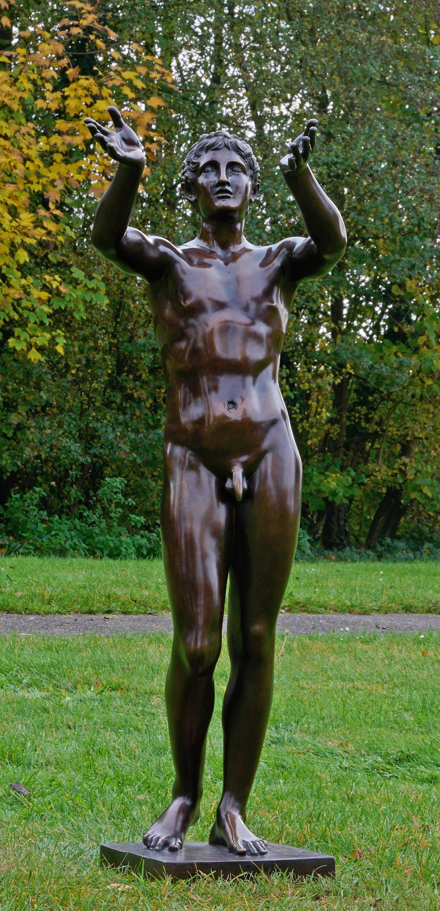 Bronze, dunkelbraun patiniert. Das Vorbild dieses "Betenden Knaben" wurde um 300 v. Chr. vom griechischen Bildhauer Lysipp oder Umkreis (Bodias?) geschaffen und befindet sich heute in den Staatlichen Museen in Berlin (Inv.-Nr. Sk2). Die um 1503 auf Rhodos gefundene antike Bronzefigur eines Knaben, bildet seit seiner Entdeckung einen Glanzpunkt verschiedener prominenter Kunstsammlungen, u. a. der Herzöge von Gonzaga in Mantua, König Charles I. von England, Nicolas Foucquet auf Schloss Vaux-le-Vicomte, Prinz Eugen von Savoyen, Wenzel Fürst von Liechtenstein. Das antike Original, um 1700 durch Anfügung der erhobenen Arme ergänzt, gelangte 1747 durch Kauf in den Besitz König Friedrich II. von Preußen und war eins von dessen Lieblings-Kunstwerken. 1786 wurde es von Sanssouci ins Berliner Schloss gebracht und um 1830 wurde das Original in das neu eröffnete Museum am Lustgarten überführt. Nach 1786 wurden diverse Abformungen, Nachschöpfungen oder Reduktionen des Originals hergestellt. H. 129 cm.